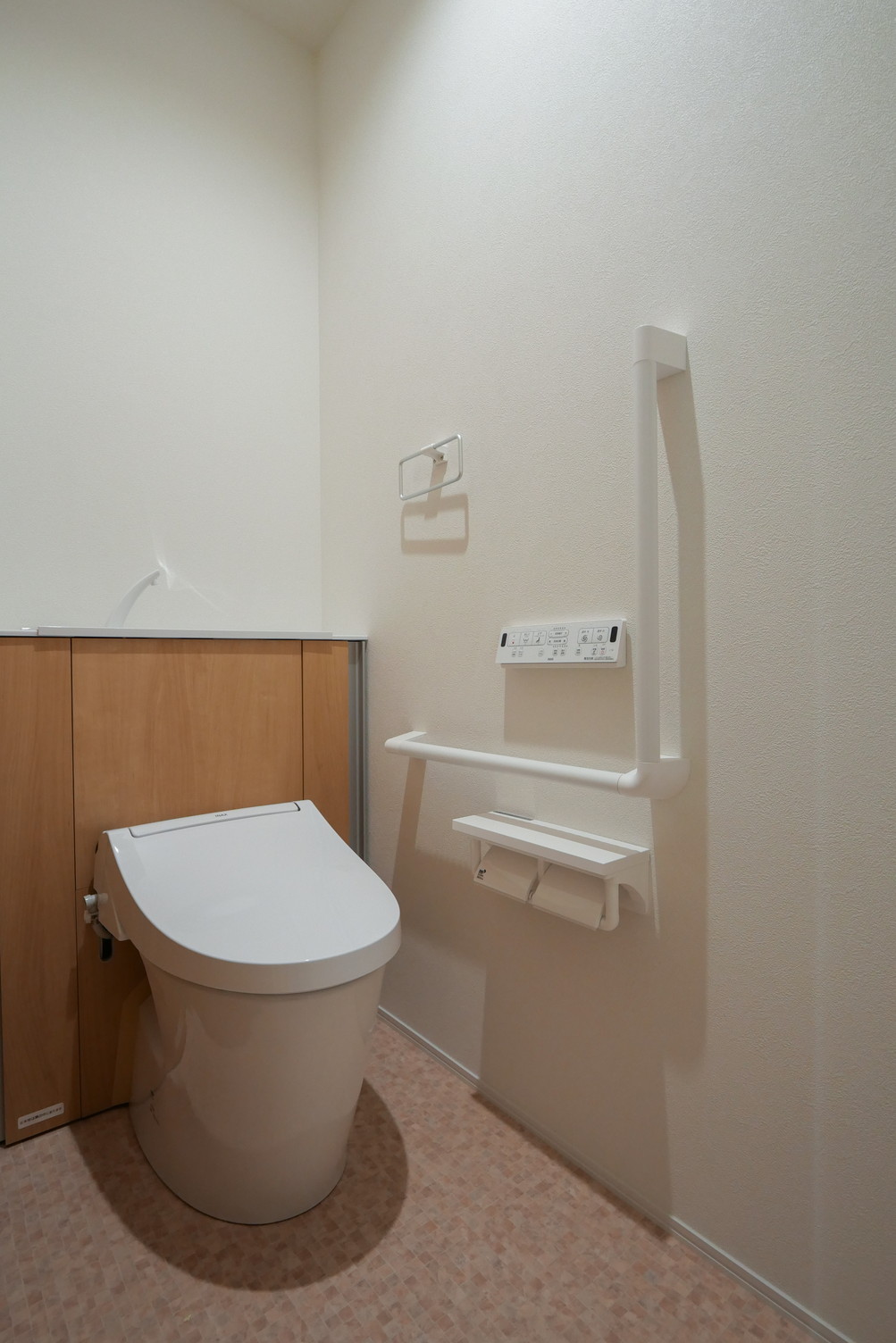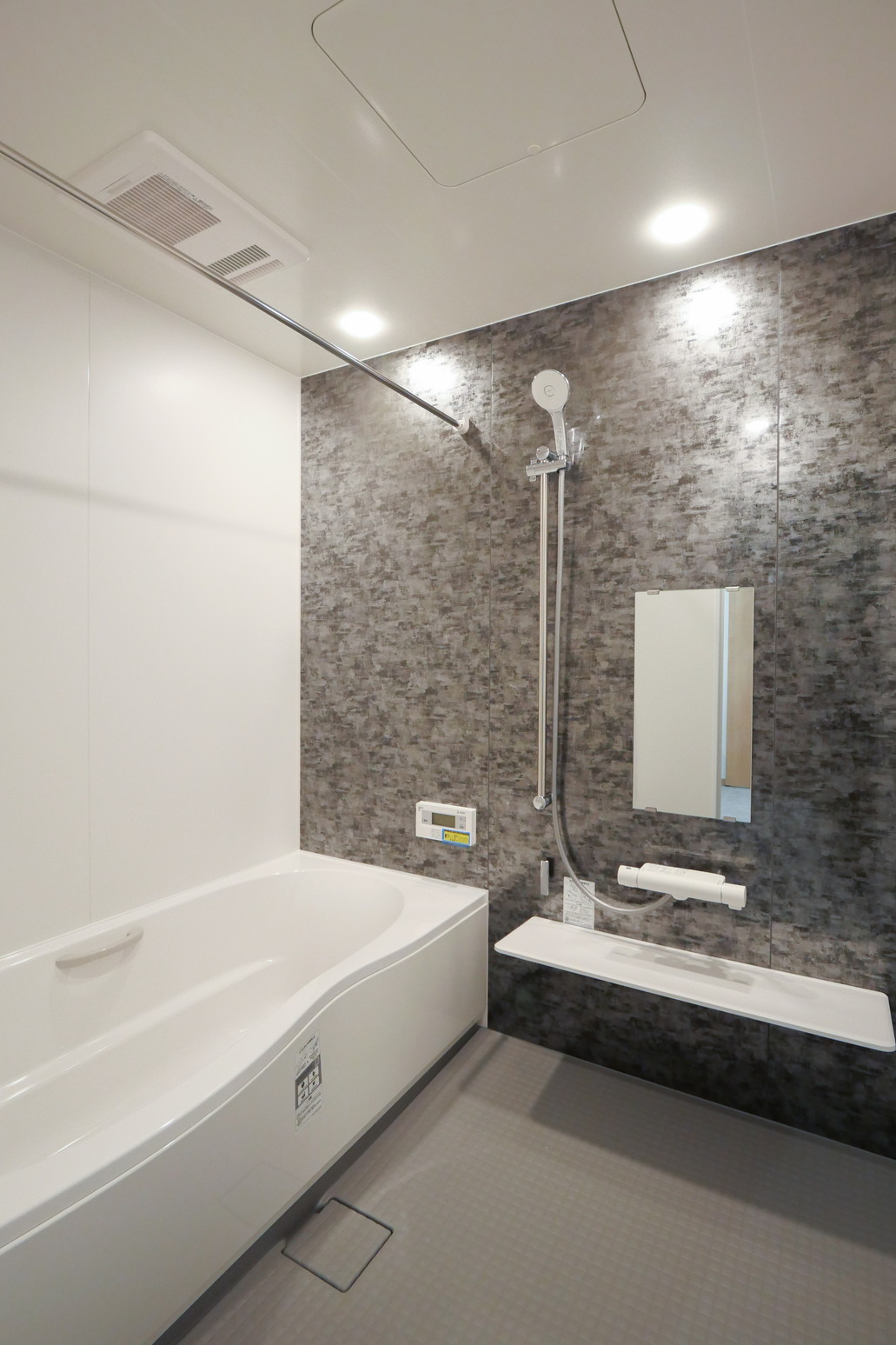 お風呂は1620サイズで少し大きめ。玄関やトイレ、お風呂等、手すりを設置しています。