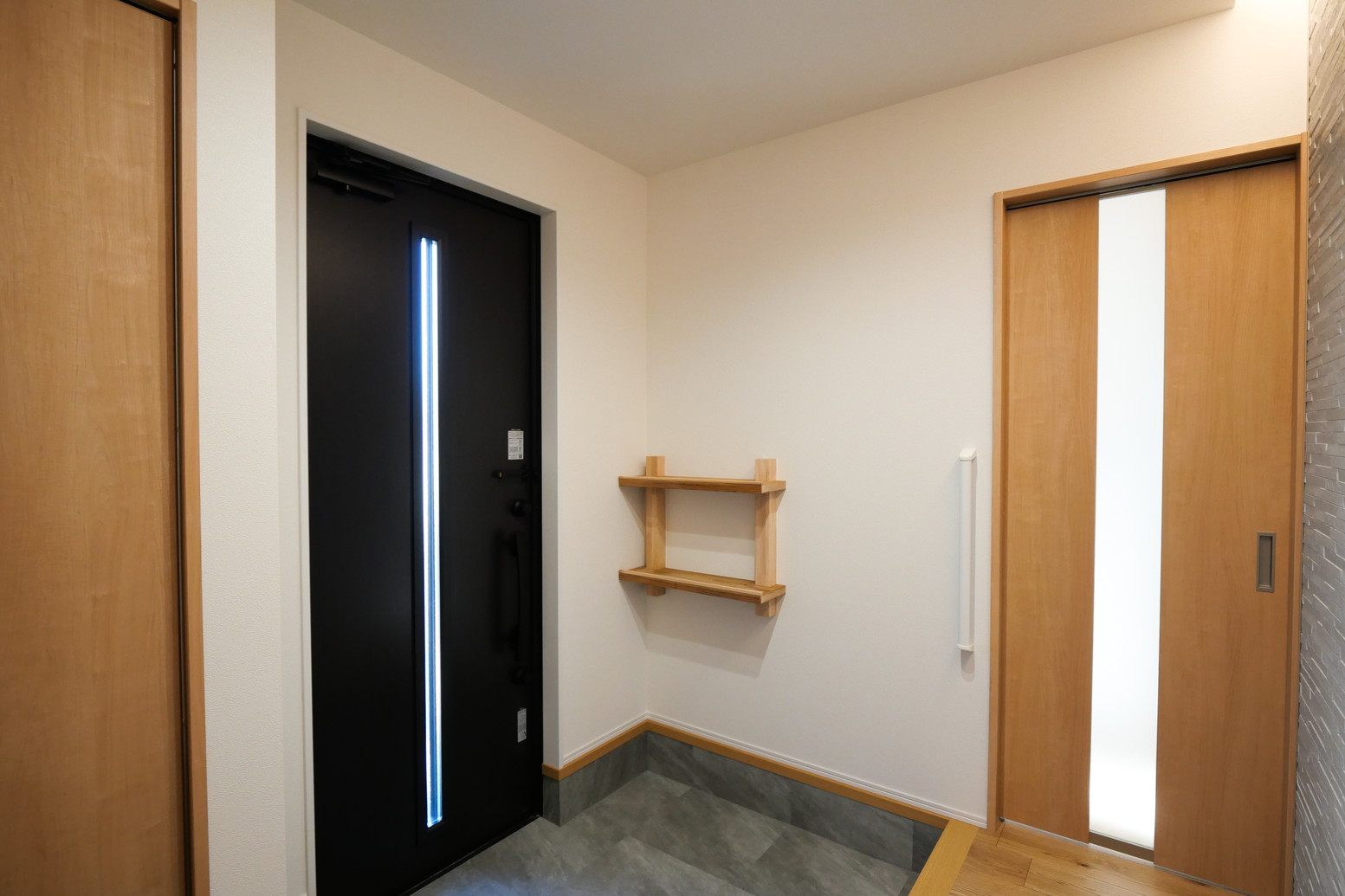 玄関入って左手に棚を設置。思い入れのある木材で作った棚は温もりを感じられます。