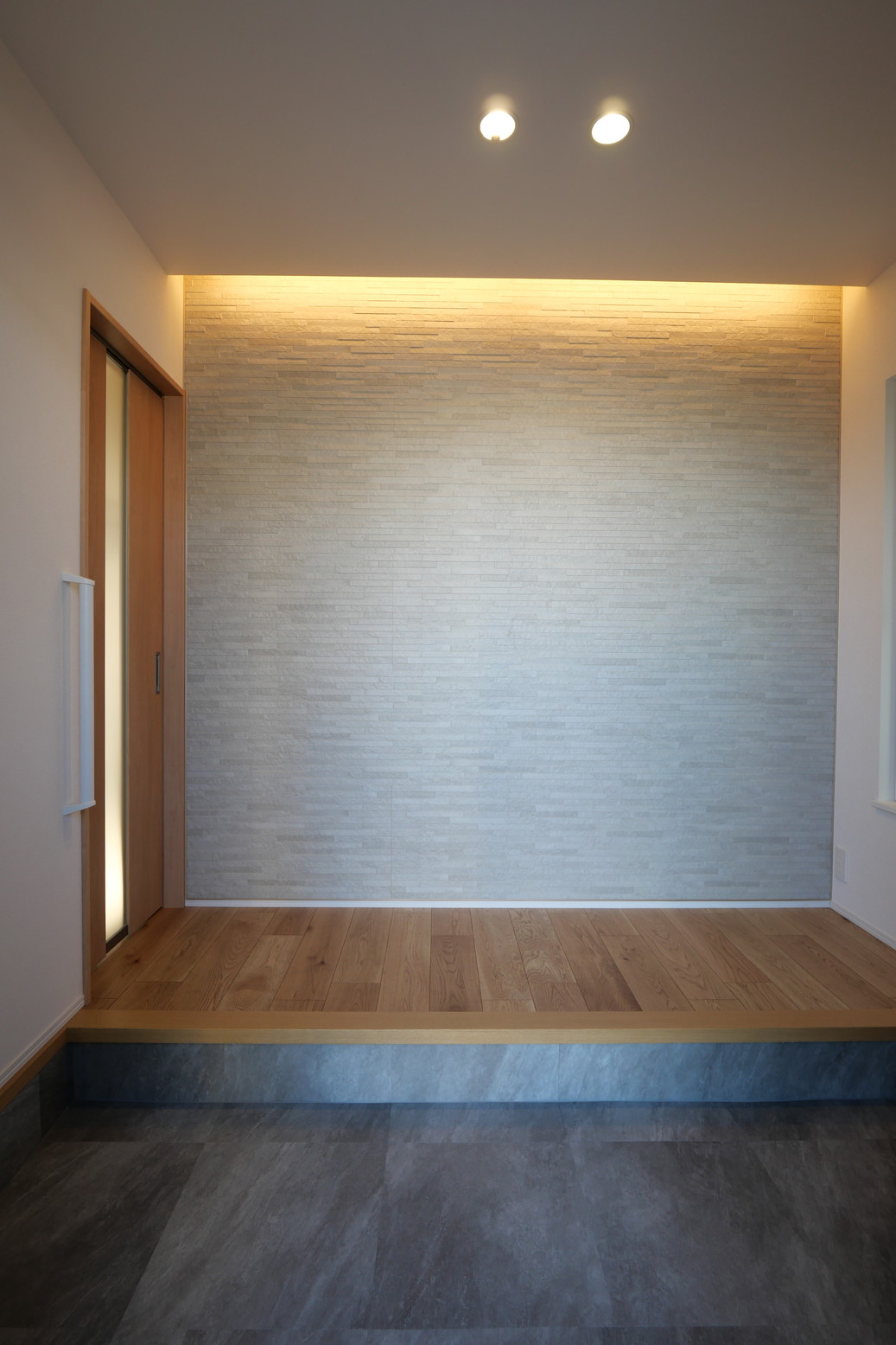 玄関ホール正面に大建のグラビオエッジを貼っています。間接照明が空間のアクセントになっています。