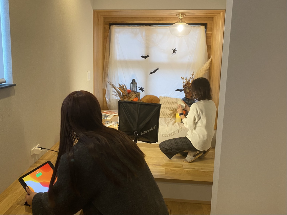 撮影は、モデルハウスの2階のヌックをフォトブースとして装飾し、