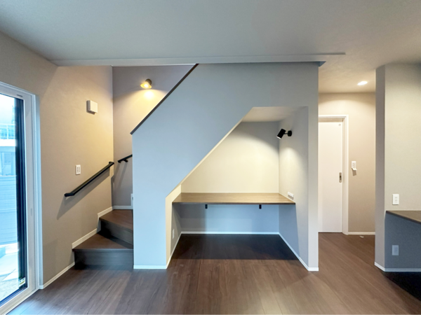 リビングの一角、階段下スペースに小さな書斎を設けた事例です。