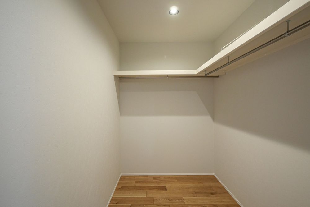 主寝室の奥には、広めのウォークインクローゼットを配置しており、衣類や小物をまとめて収納できます。