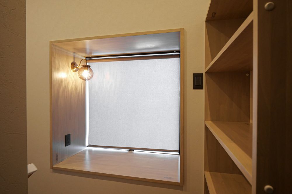 階段の踊り場部分には、ヌックを設けました。FIX窓から光が入るぽかぽかと暖かい場所で、ゆったりと本を読める空間です。