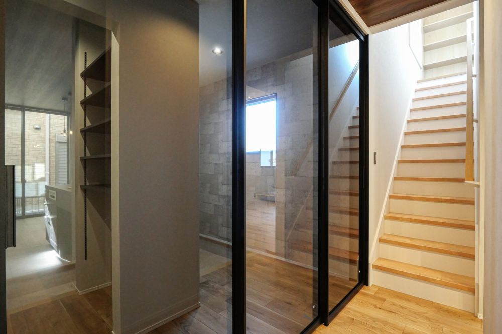 靴を脱いで上がった先には、存在感のある引き戸を配置。