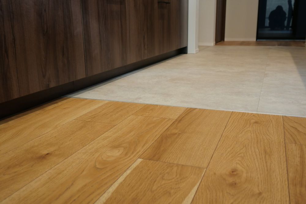 ダイニング部分には突板フローリングを、キッチンまわりにはシート材フローリングを採用しています。