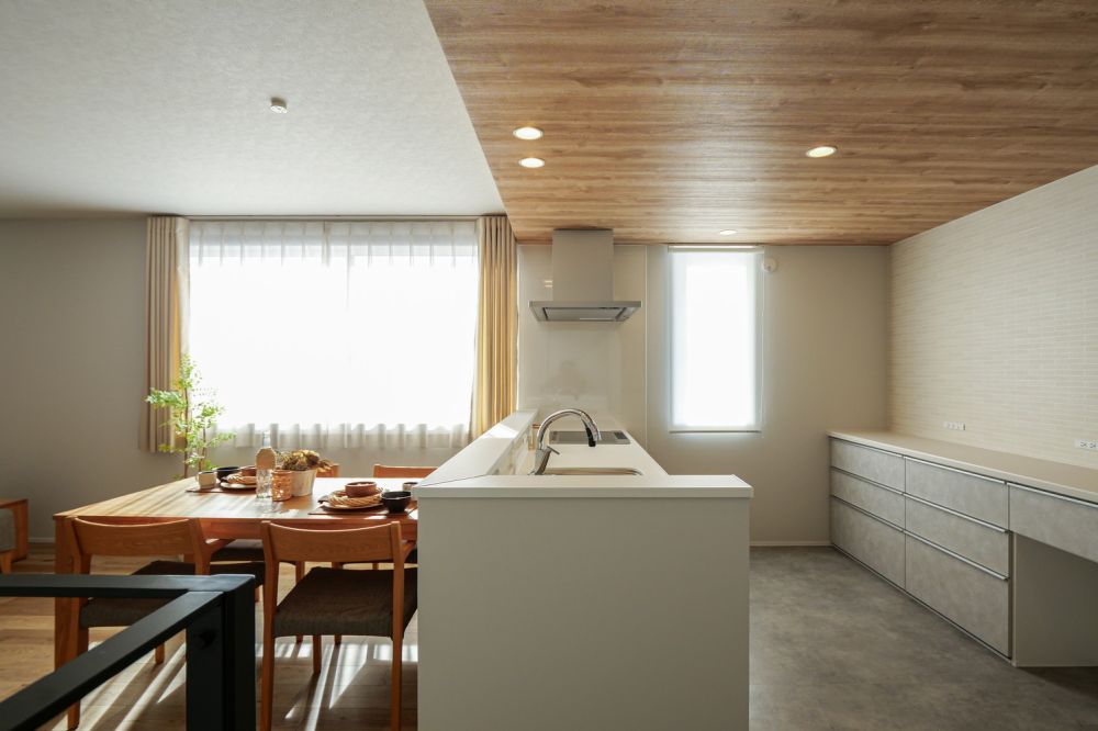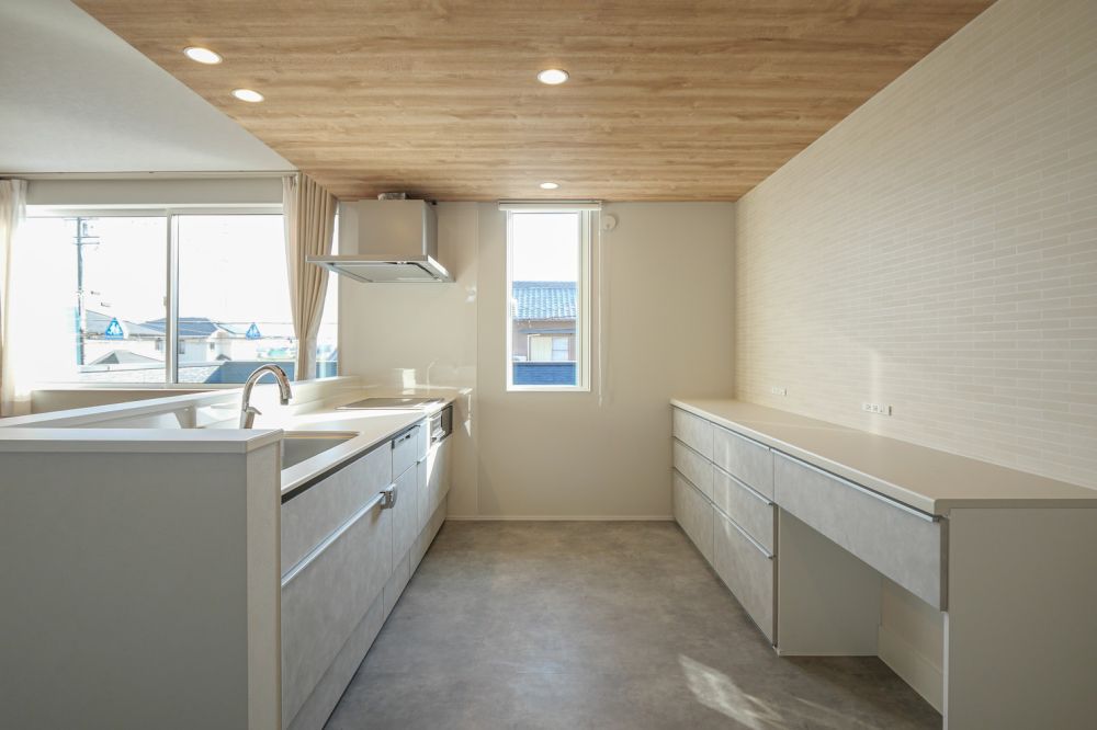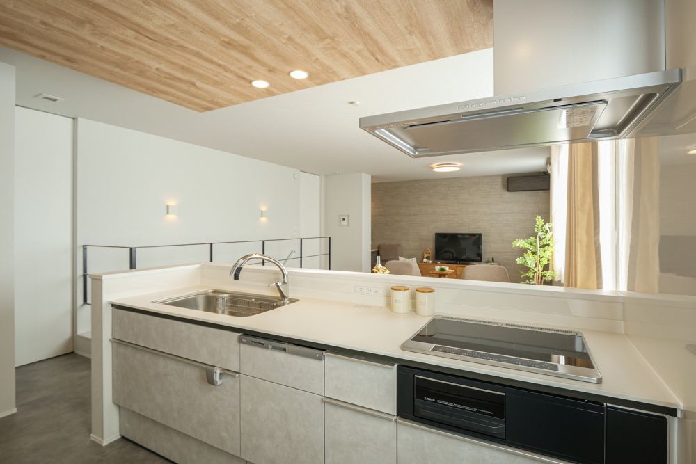 キッチンまわりには立ち上がりを設け、リビング側から手元が見えにくい工夫を加えました。