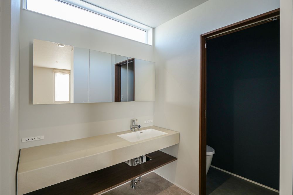 三面鏡も洗面台に合わせて横長タイプを設置し、鏡裏は可動棚収納に。背の高いアイテムもすっきり収まります。