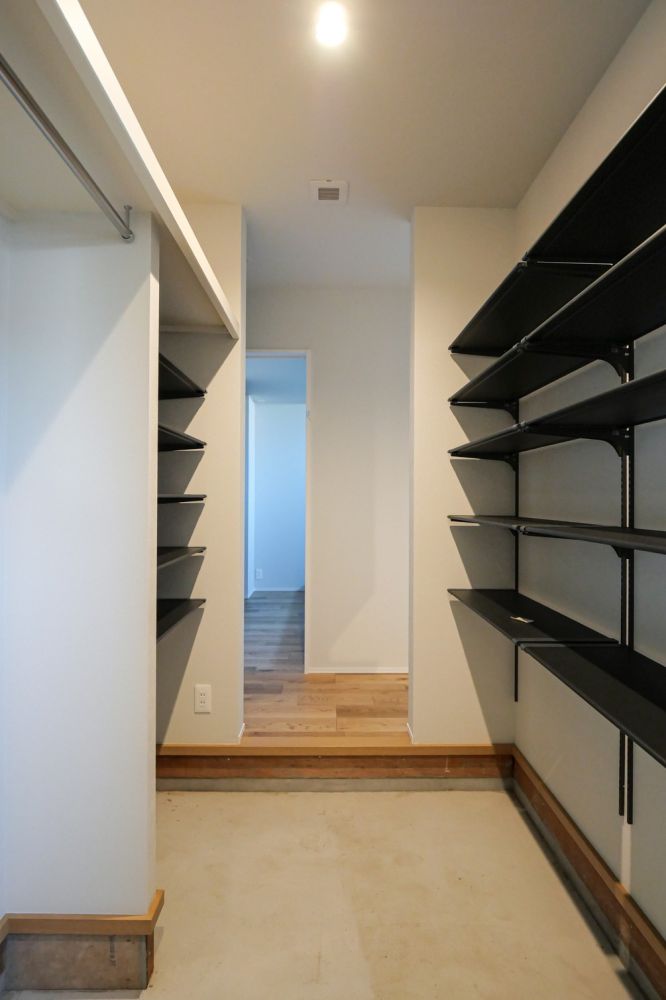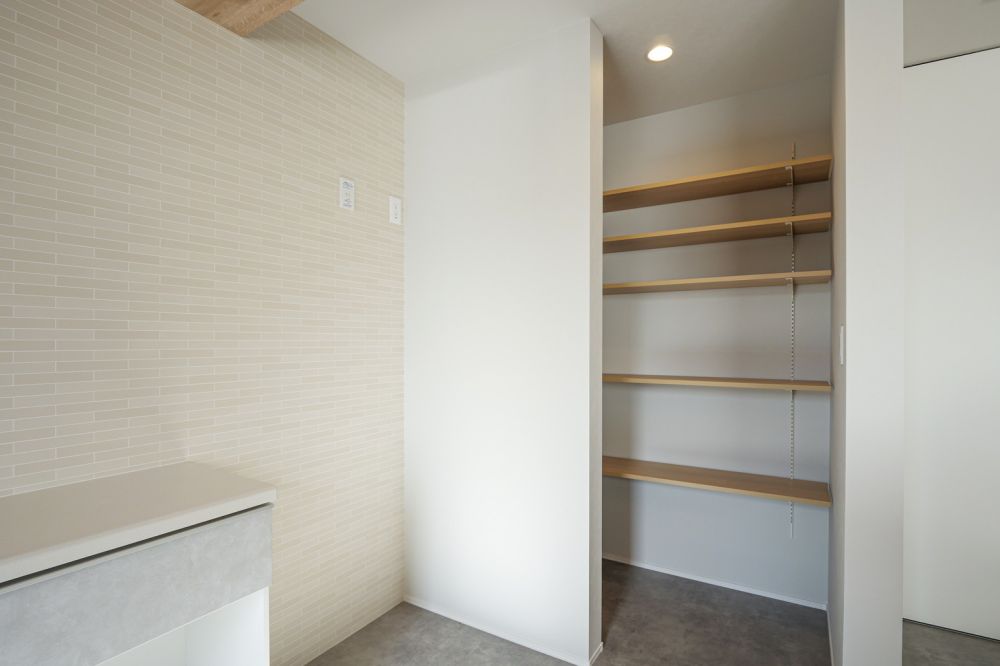 キッチン横にはパントリーを設置。可動棚のため、収納する物に合わせて柔軟に調整でき、無駄のない空間活用が可能です。