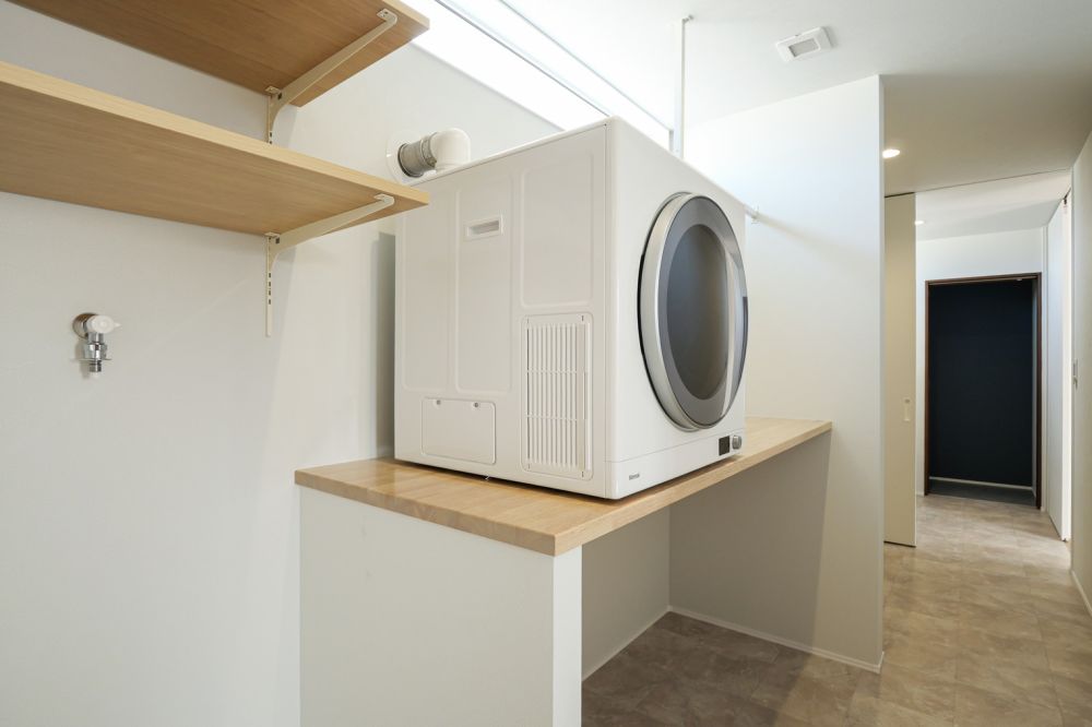 3畳のランドリールームには、乾太くんを設置。容量は一番大きなサイズを選び、洗濯の負担を軽減しています。