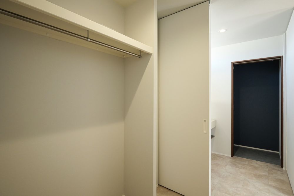 ランドリールームの奥には、ウォークスルークローゼットを配置。ハンガー収納を基本としつつ、暮らしに合わせて収納ボックスを置ける余白も残しました。