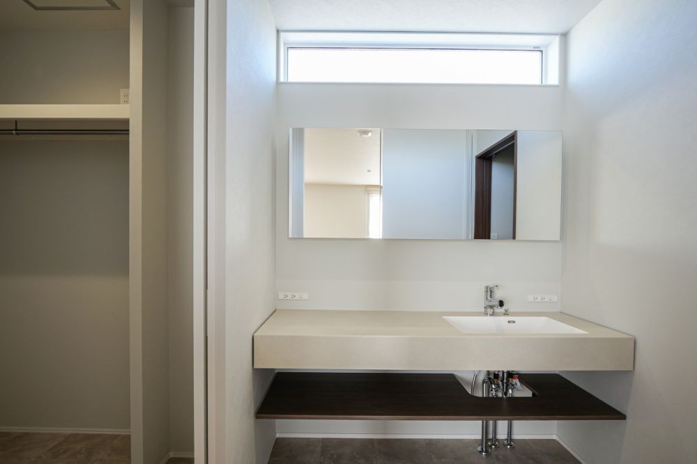 洗面台はアイカ工業のスマートサニタリーUを採用。約1600mmの幅があり、2人並んで使うこともできます。