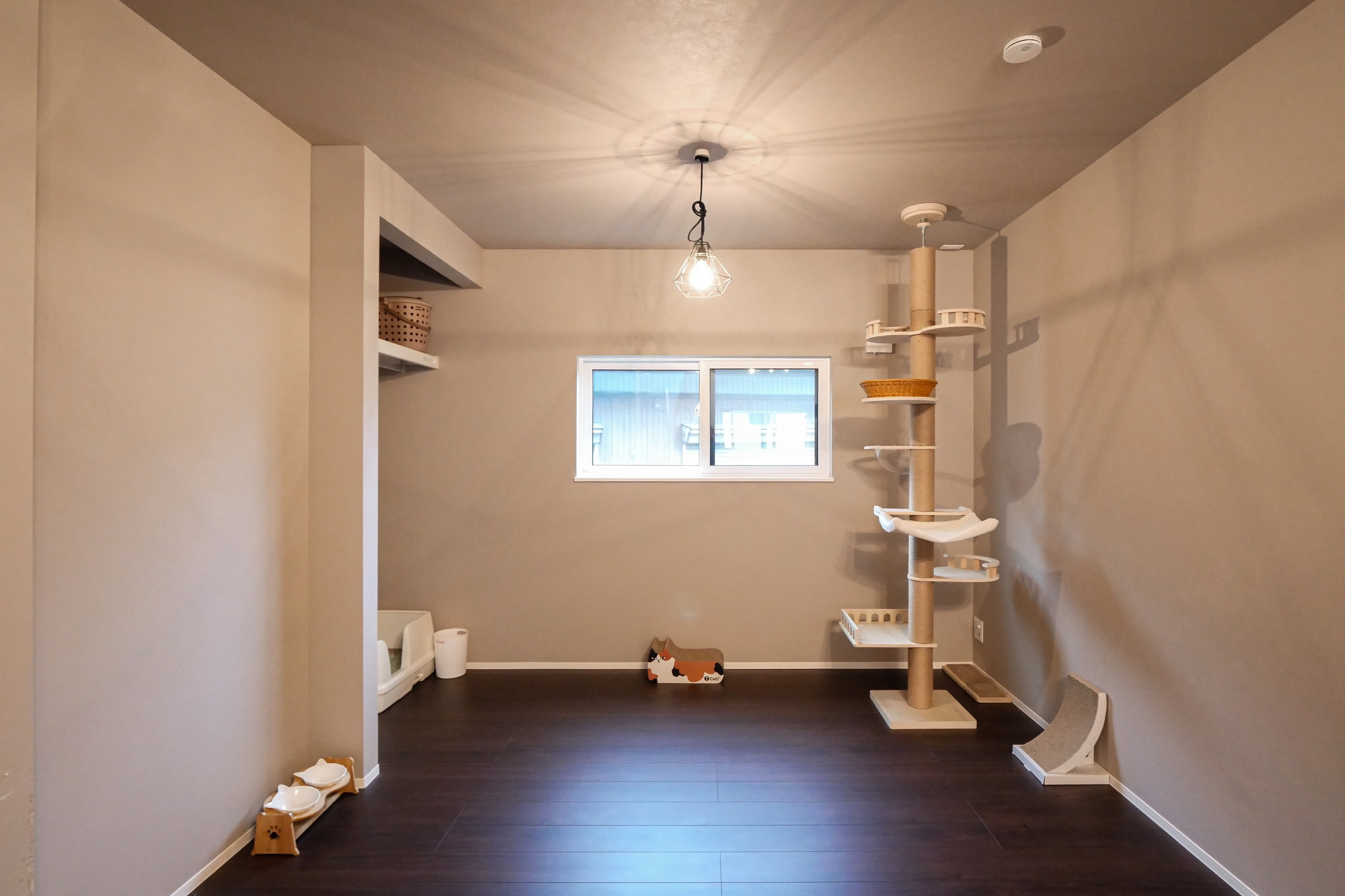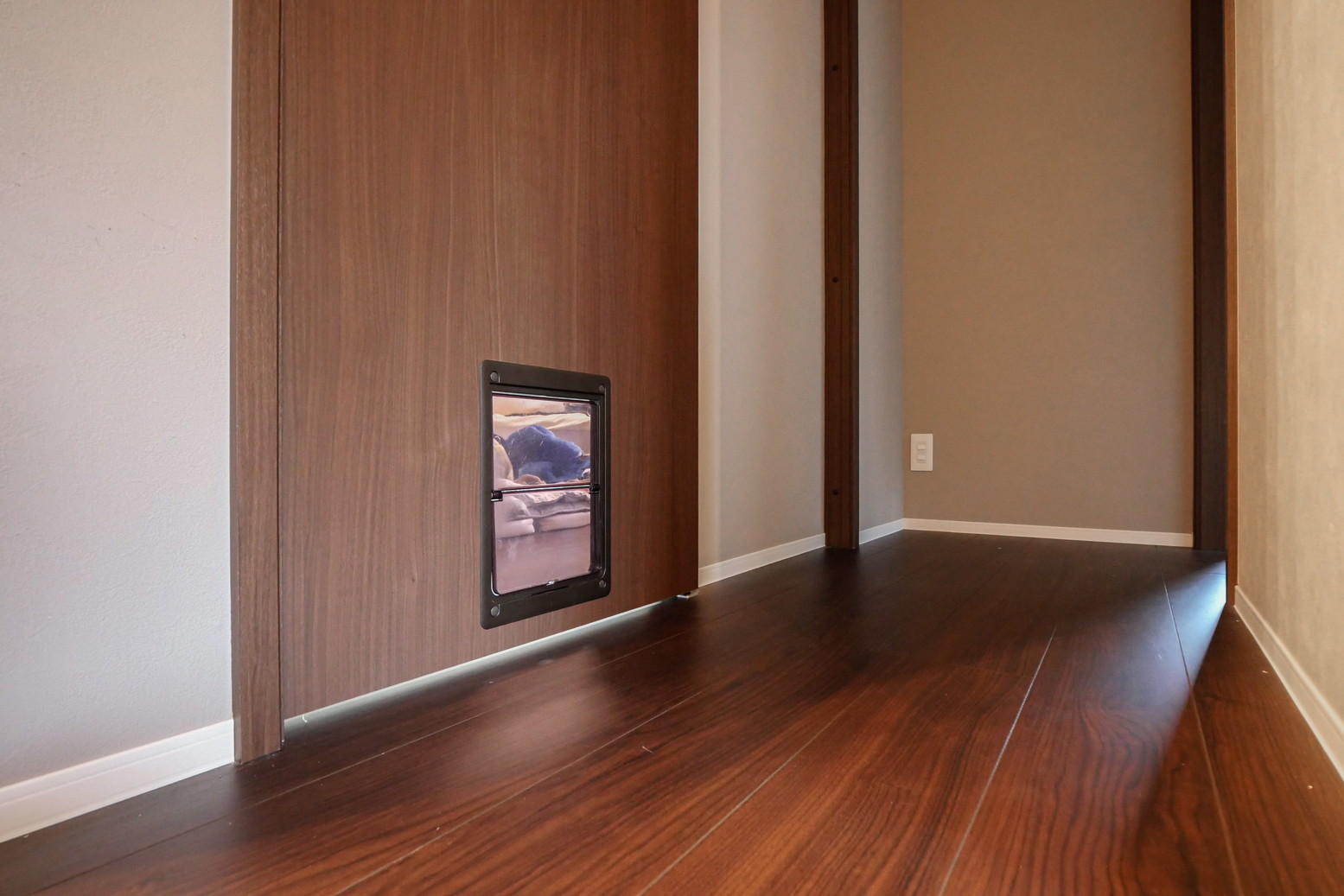 寝室にはネコ用の扉を設けました。全体的にはシンプルなデザインにして、生活スタイルが変わっても対応できるようにしています。