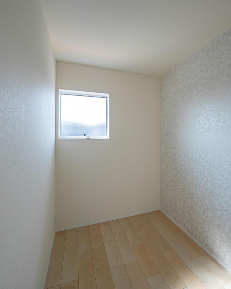 階段を上がった先にある主寝室は、広々とした空間です。グレーのアクセントクロスが、空間に落ち着いた印象を与えています。