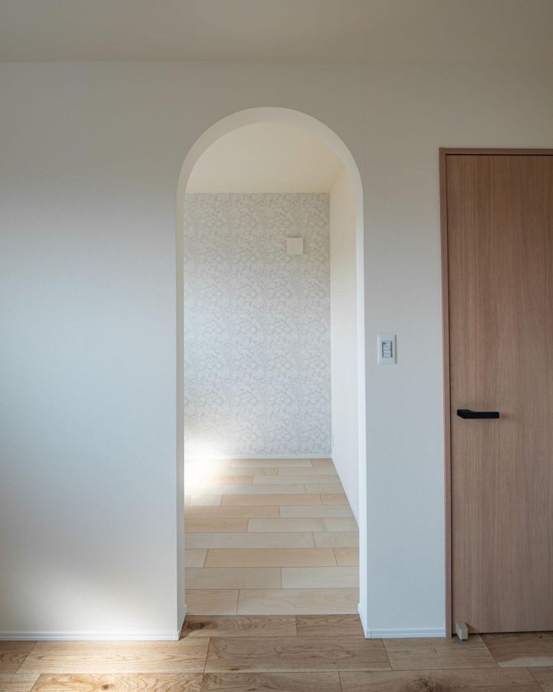 シューズクロークの間口はアーチ型に。今回のお宅はこのアーチ型の間口を複数採用しています。