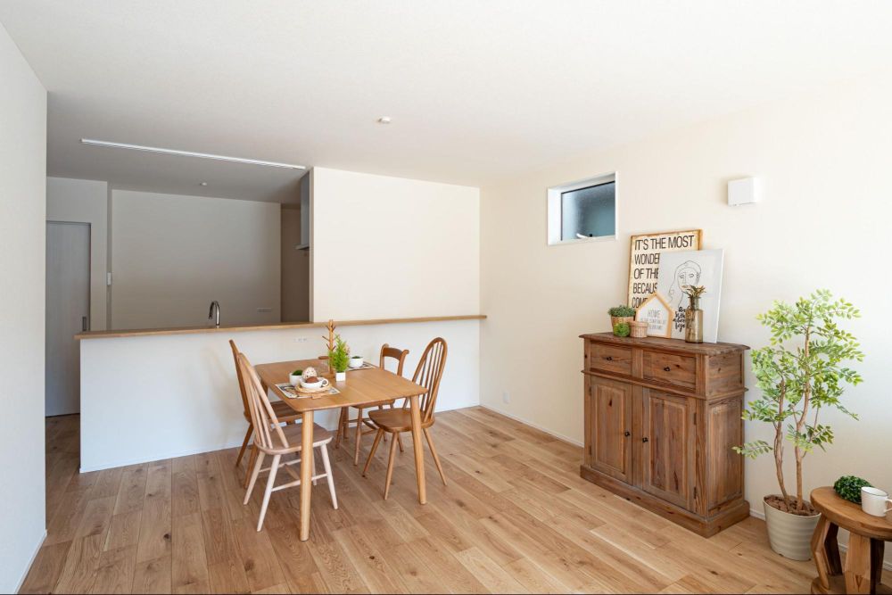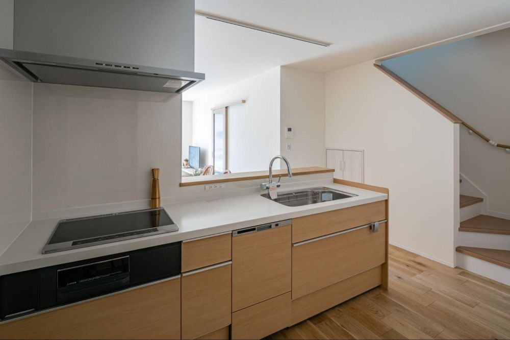 ダイニングにはキッチンカウンターを設けており、リビング側からはキッチンの手元が見えない設計に。台所を預かる人にとって嬉しい配慮です。