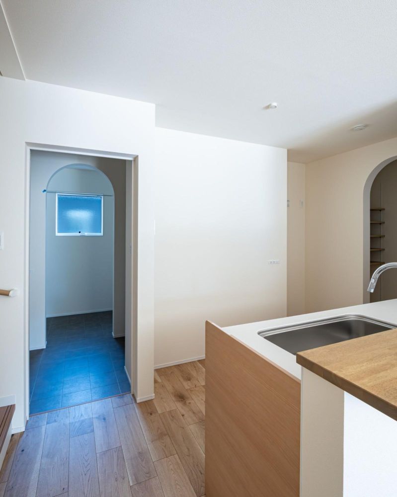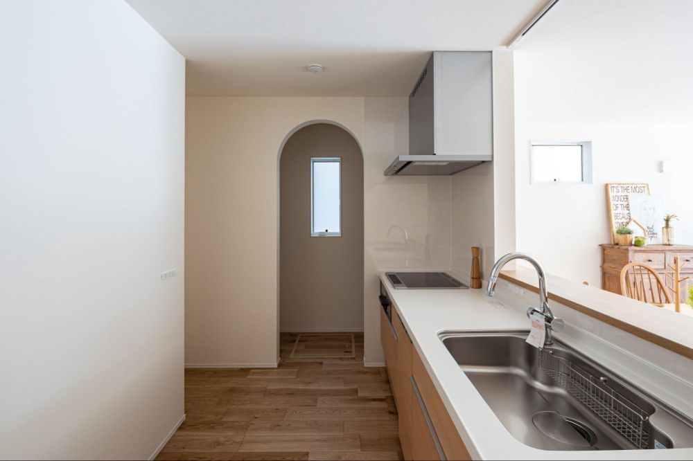 キッチン背面の扉からは、洗面所へとつながっています。家事動線がコンパクトにまとまっており、毎日の家事をスムーズに進められる間取りです。