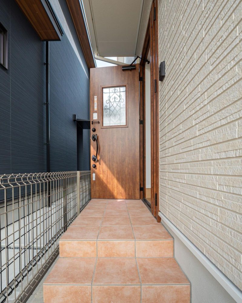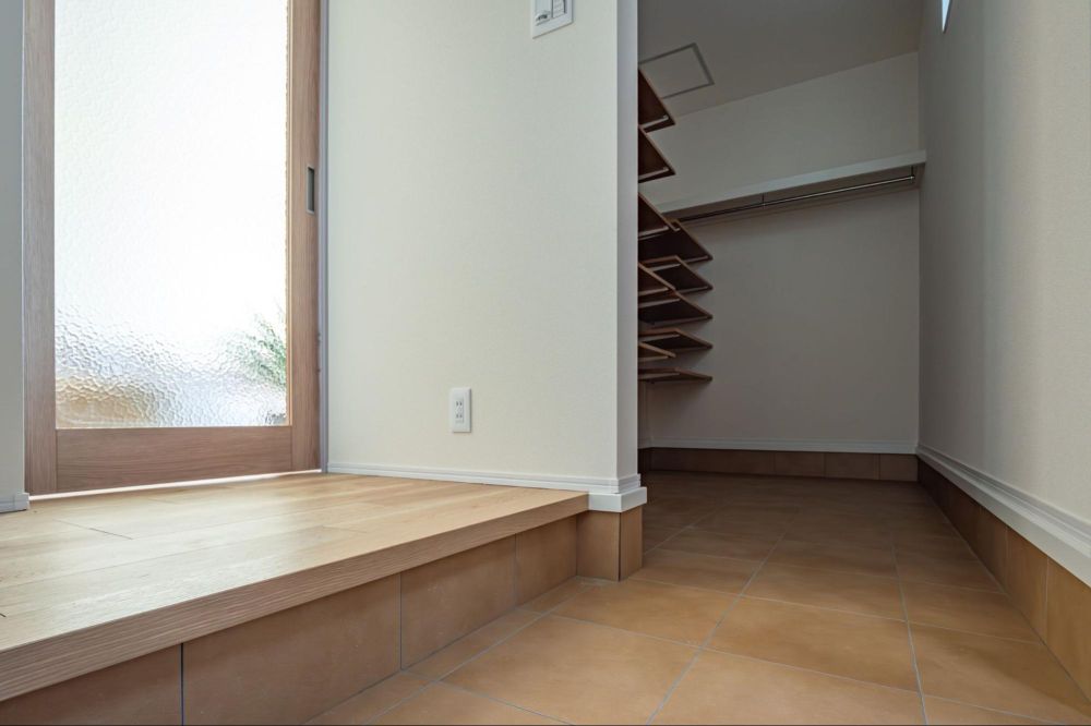 ポーチのタイルはテラコッタデザインを採用しました。玄関土間も同じデザインで合わせることで、外と中に自然なつながりを生み出しています。