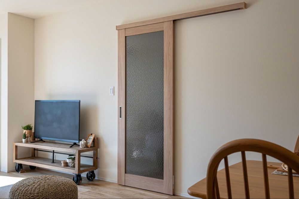 リビングの扉は引き戸で、ガラス部分が多いタイプを採用。ガラスのデザインもアンティーク調で、空間のテイストに自然と溶け込んでいます。