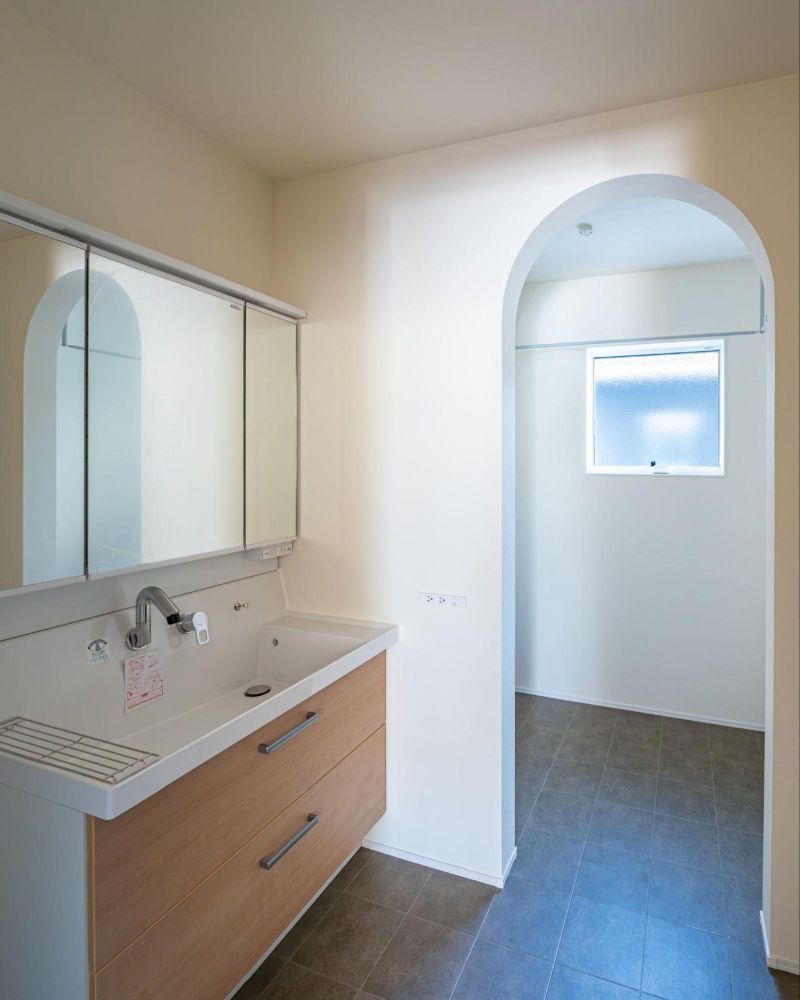 洗面所の横にはランドリールームを設置。こちらの間口もR加工で、リビングから続くやわらかな雰囲気を保っています。