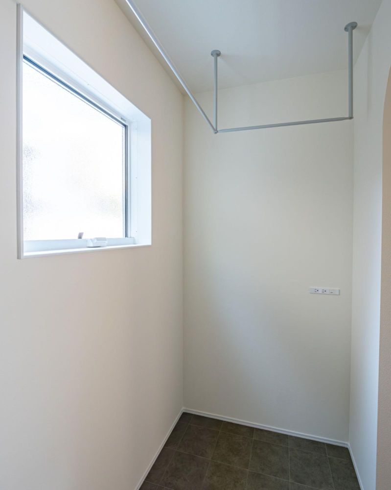 ランドリールーム内の物干しハンガーはL字に設けているため、洗濯物をたっぷり干すことができます。窓と換気扇も設置しており、ニオイやカビ対策もしっかりと配慮。
