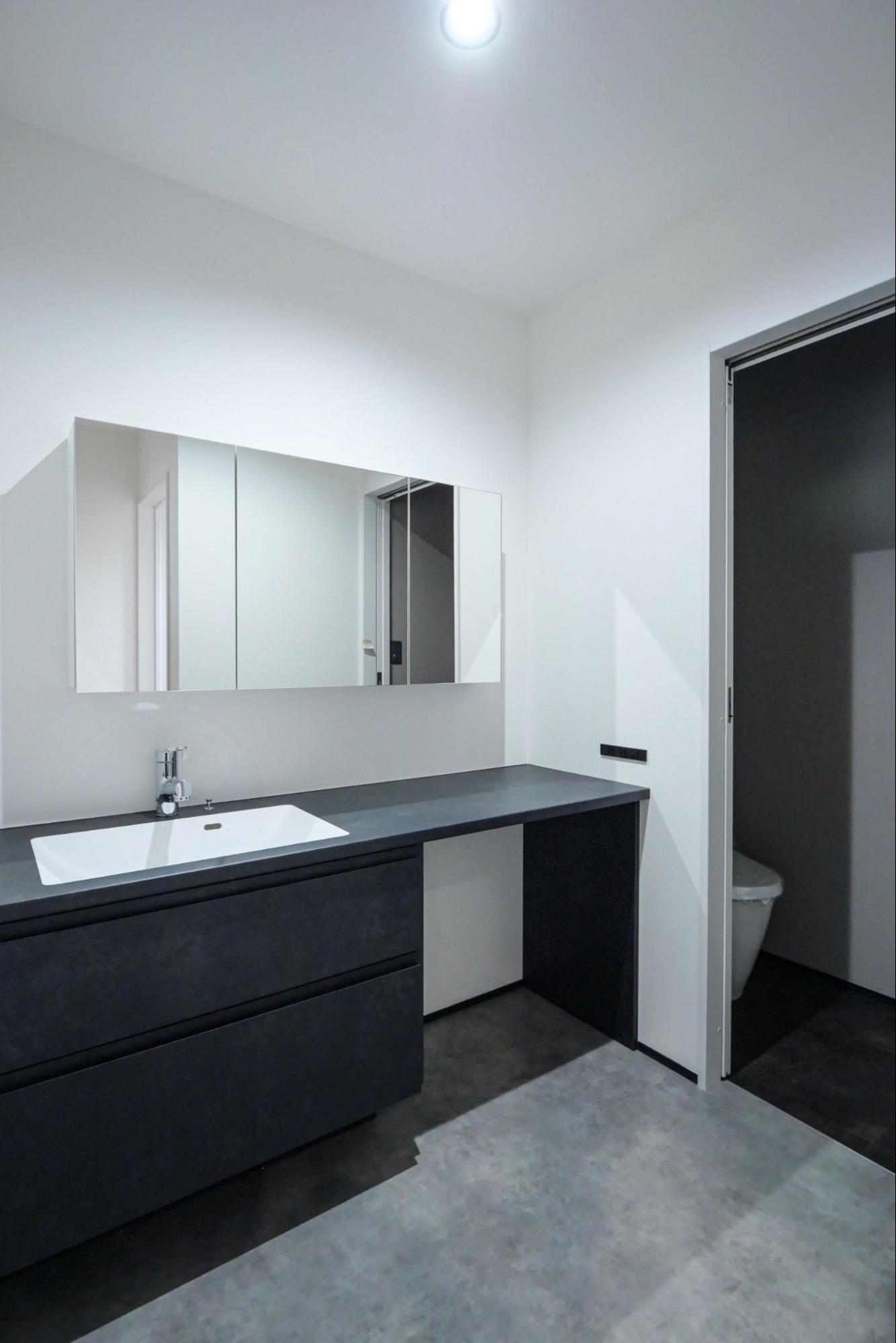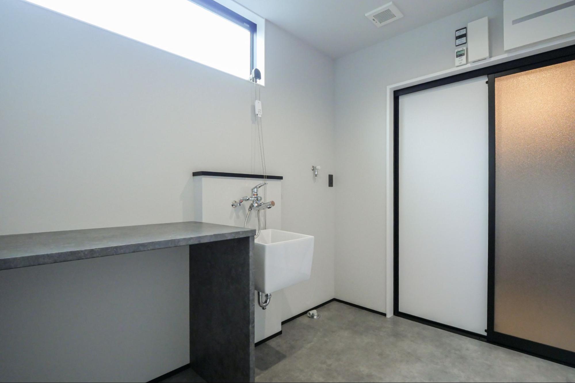 ランドリールームもモノトーンで統一。色数を絞ることで、水まわり特有の清潔感がより際立つ空間になります。