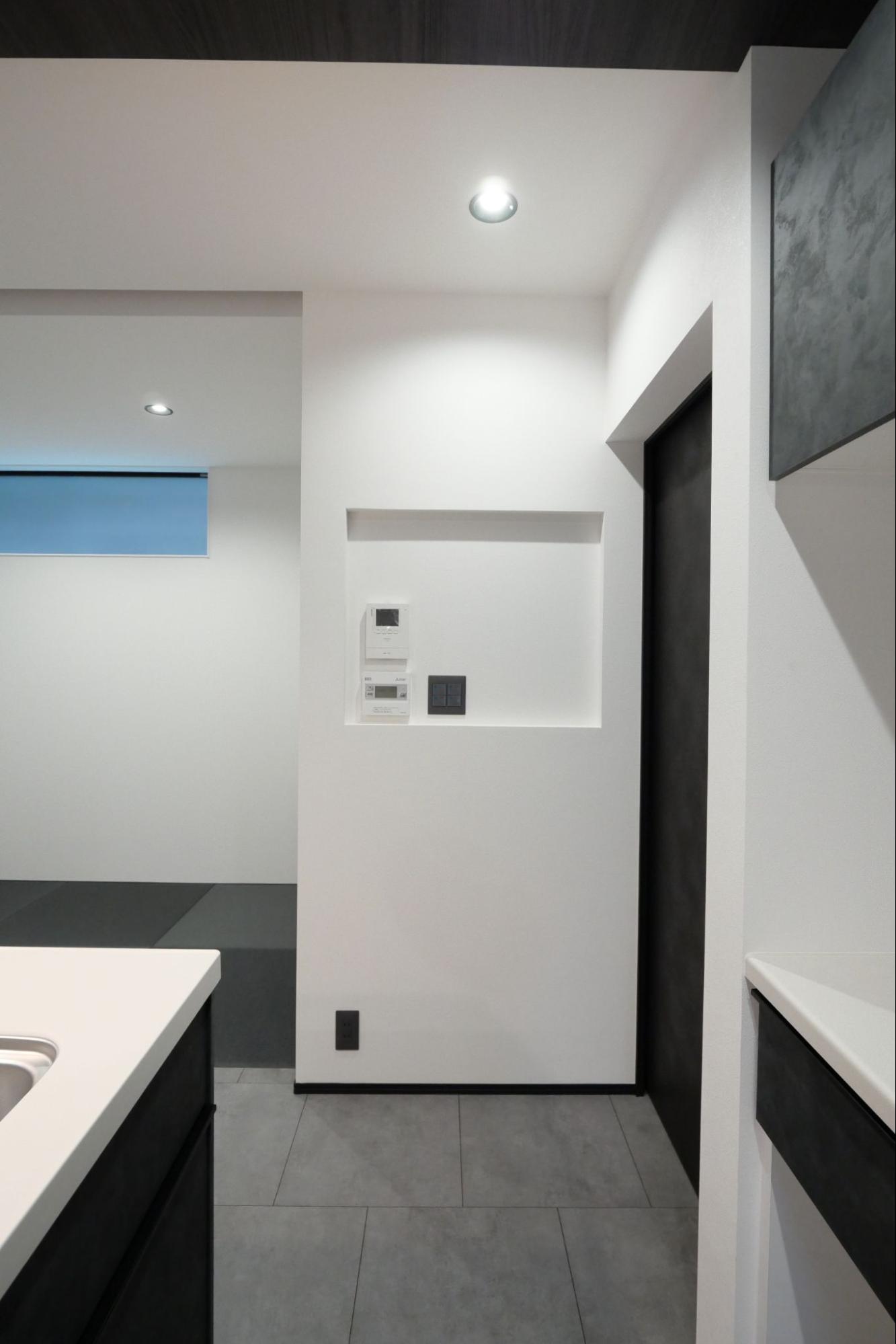 キッチン横にはニッチ収納も設けて、リモコン類をまとめて収納できるようにレイアウトしました。