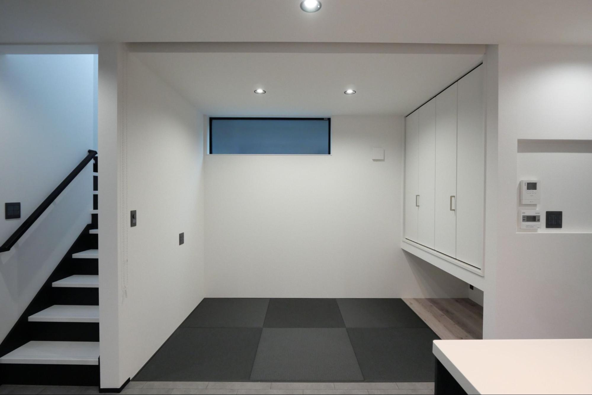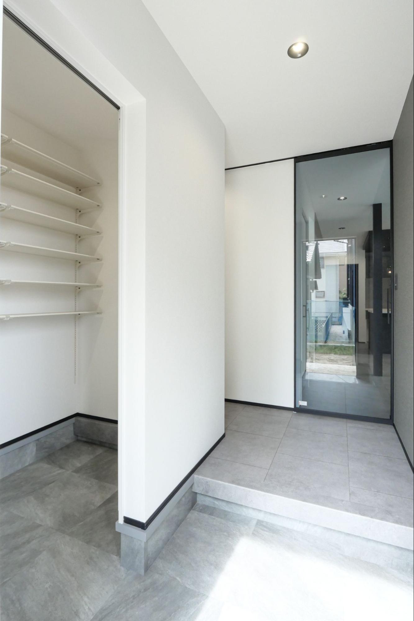 今回のお宅のテーマカラーはモノトーン。玄関はホワイトとグレーを基調に、すっきりとした雰囲気でまとめています。