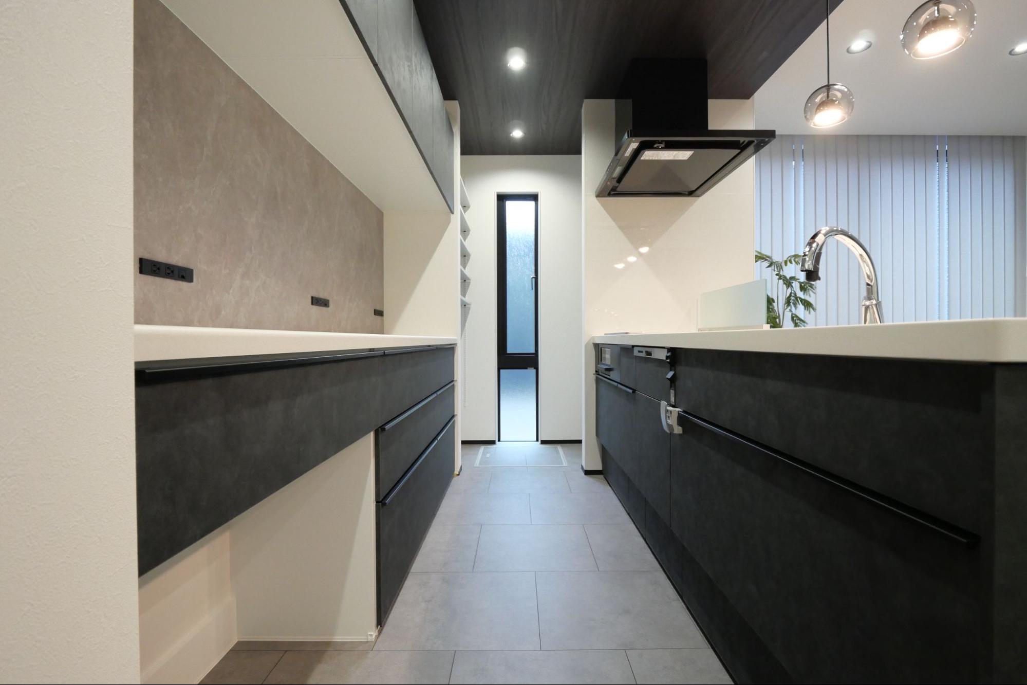 キッチン奥には通風と採光を取り込む縦長の窓を設けました。その手前にパントリーと冷蔵庫を配置し、生活感の出やすい物はしっかり隠すレイアウトに。