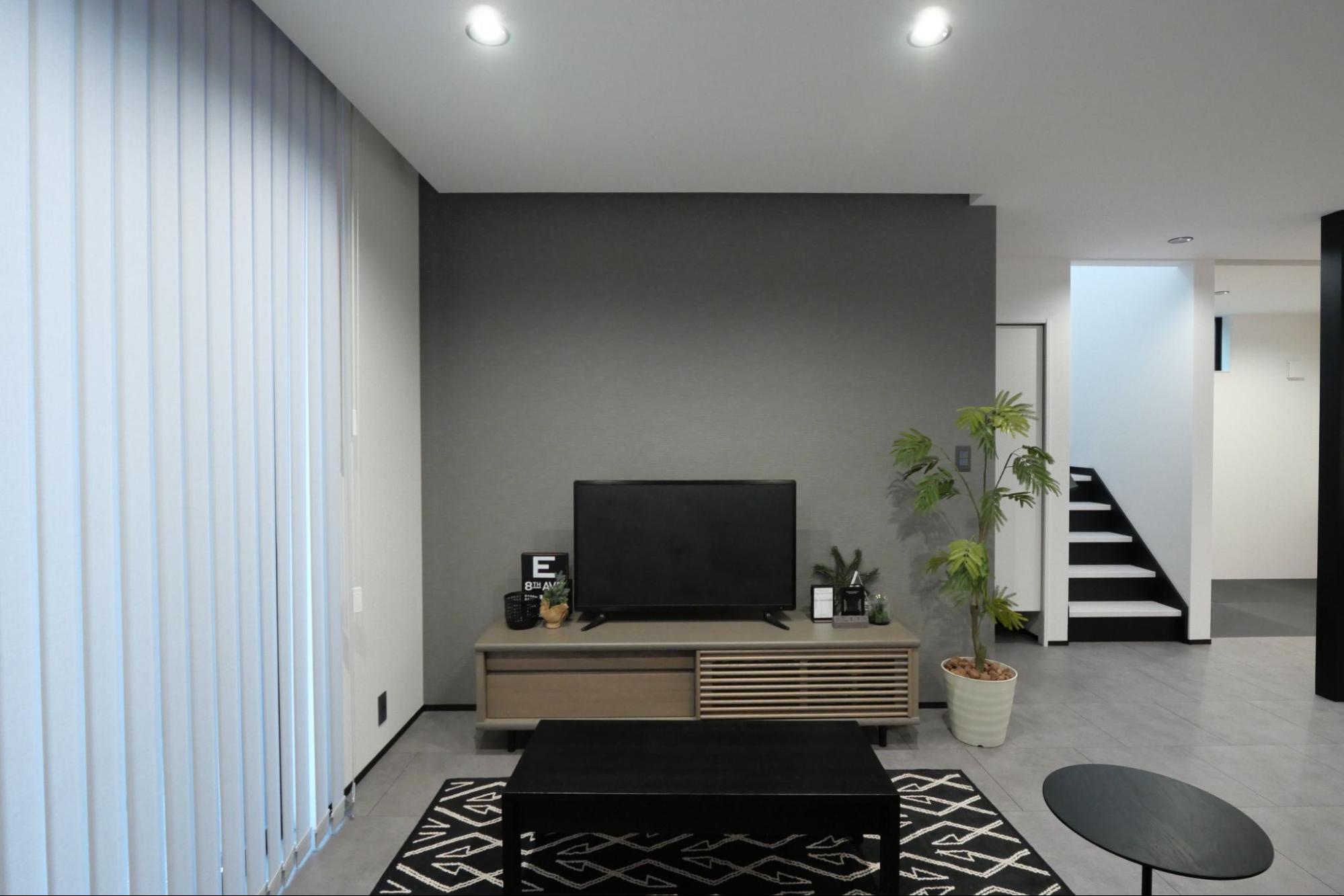 テレビ背面の壁はグレーに。床材とカラーを合わせることで、リビング全体に統一感が生まれます。