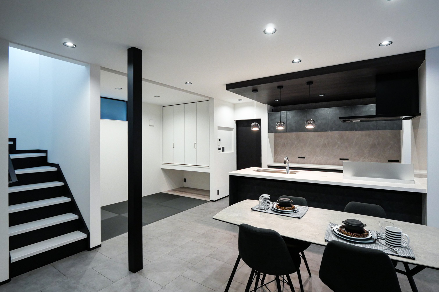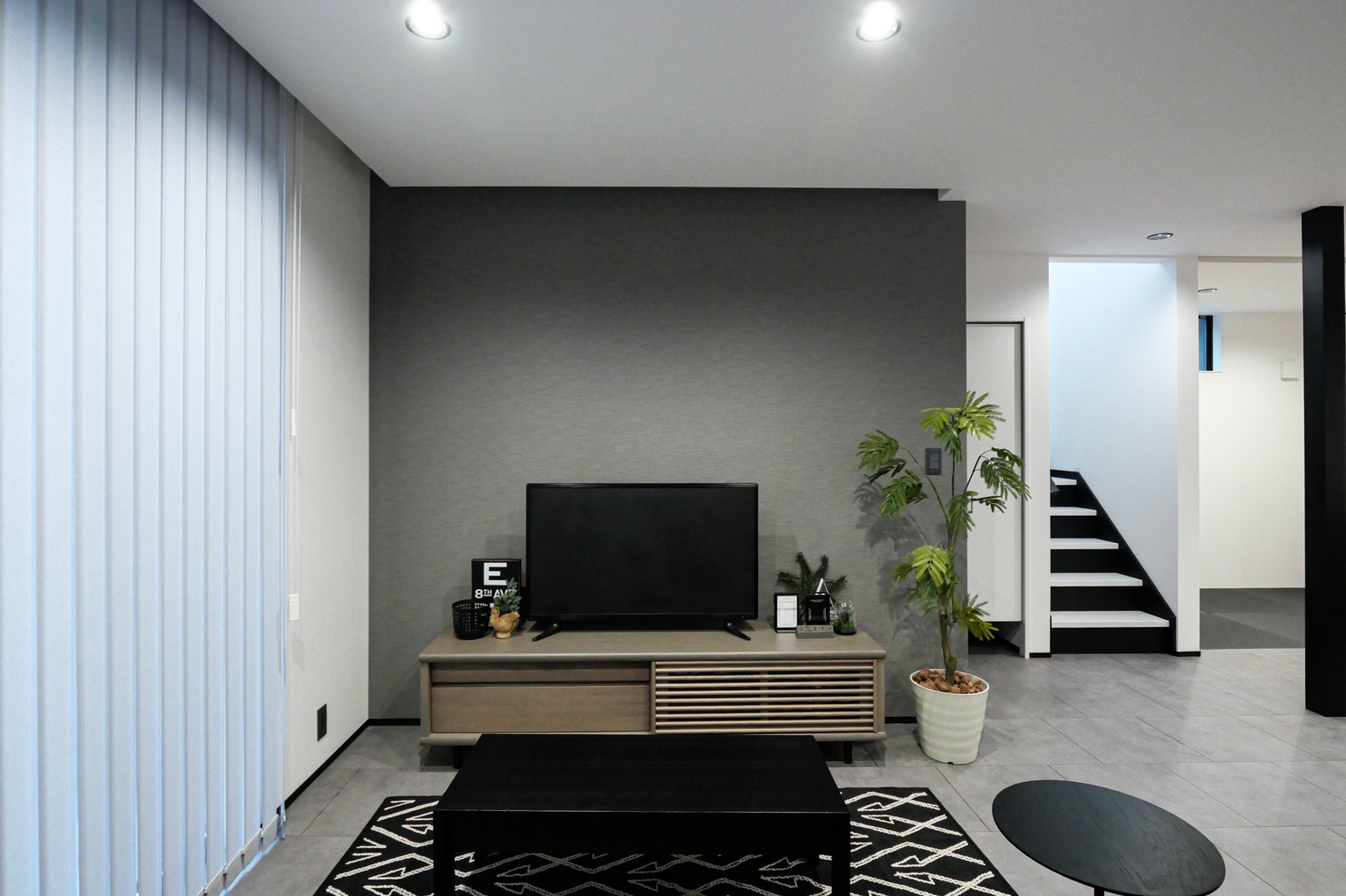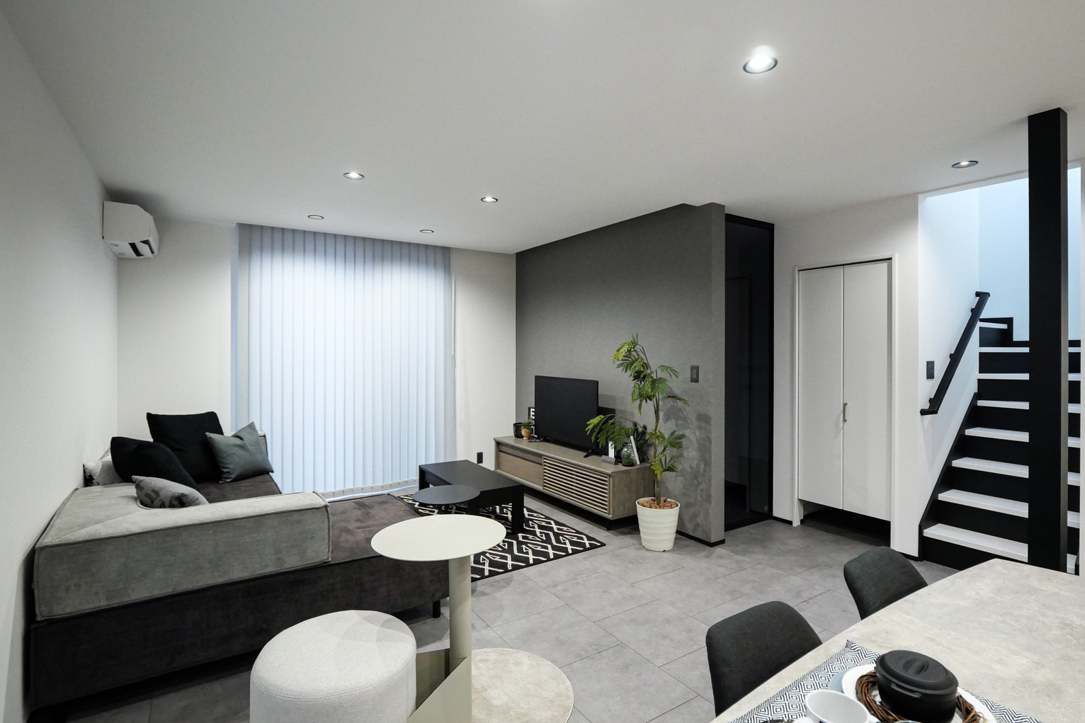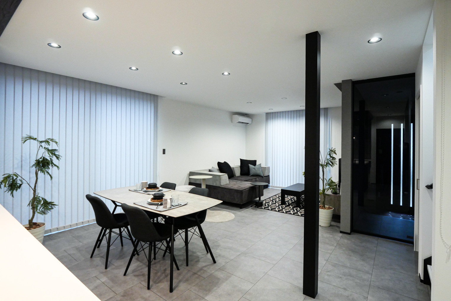 1Fの床材はラシッサD「ラフモルタル調」を採用。クールでスタイリッシュな印象の空間に。