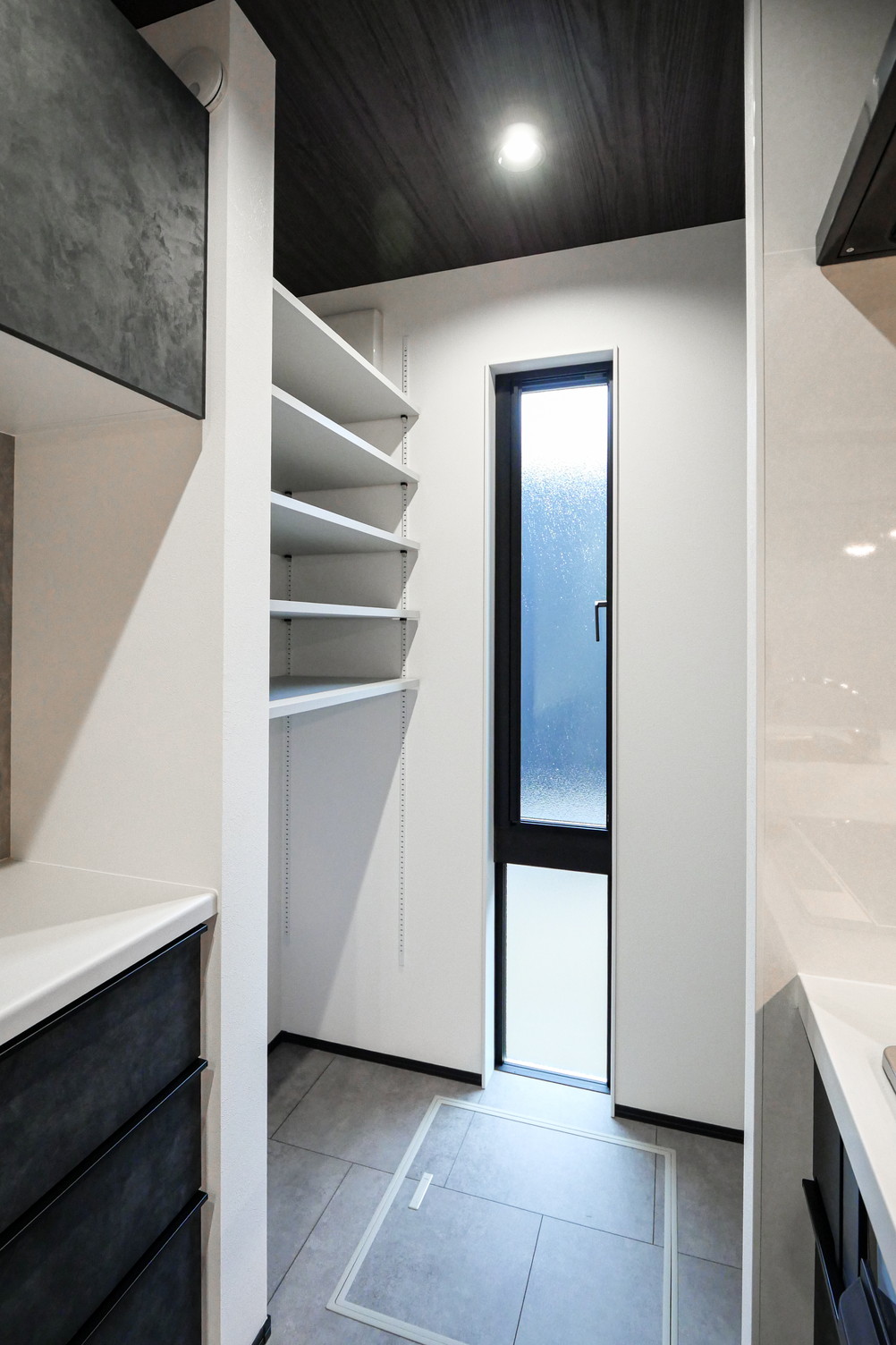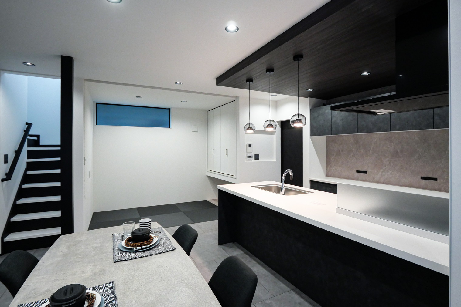 建具やクロスを中心にダーク系カラーを随所に取り入れた住まい。