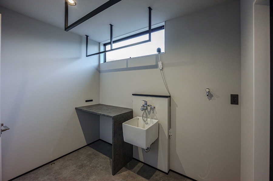 ランドリールームの壁紙には、撥水性のあるハードストレッチ壁紙を採用。水跳ね湿気に強く、家事はしやすい快適な空間に仕上げました。あた、天井には室内干し用の「Kacu」を3本設置し、ハンガーパイプ付きの使用でたっぷり干せるようにしています。