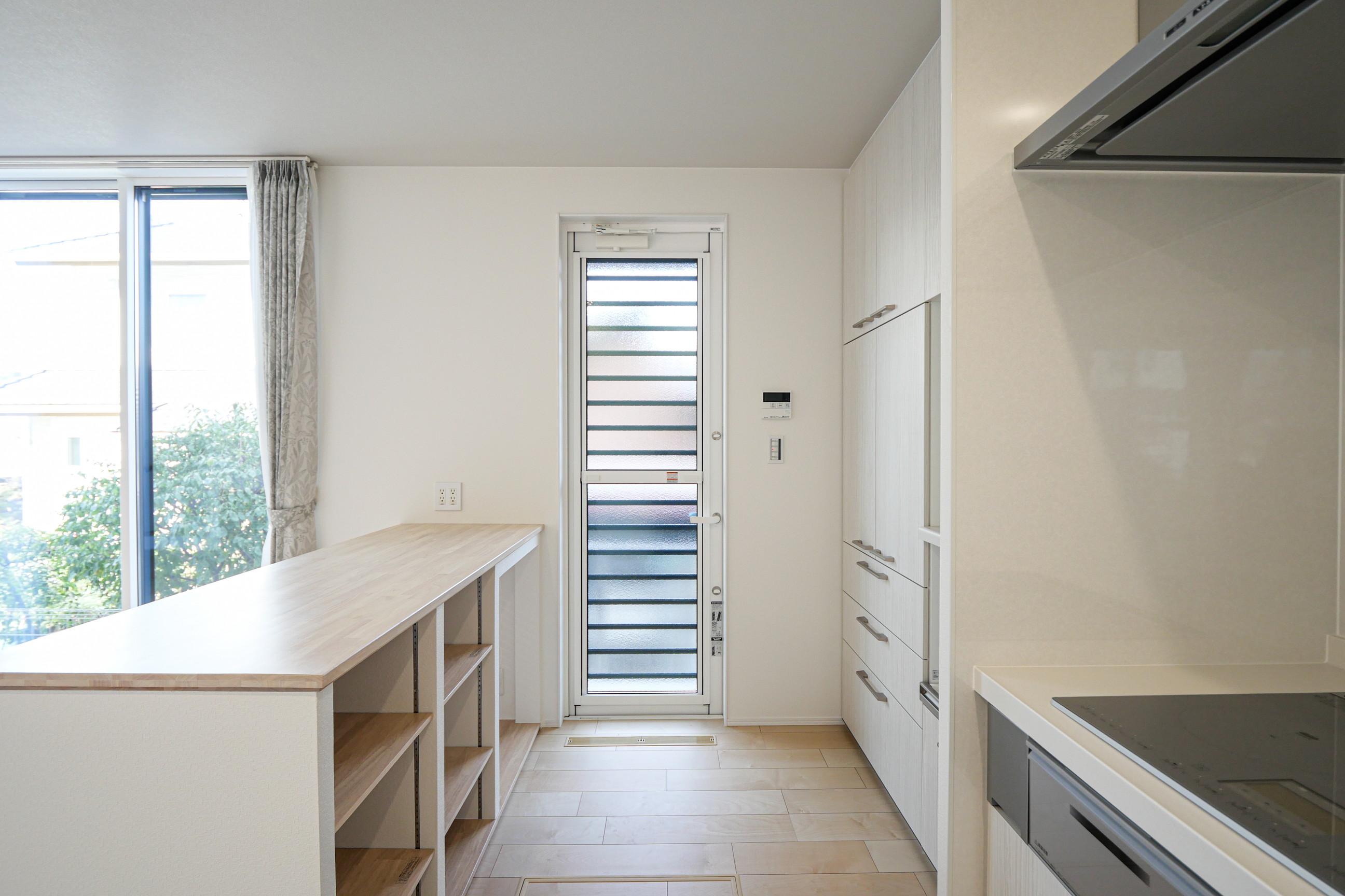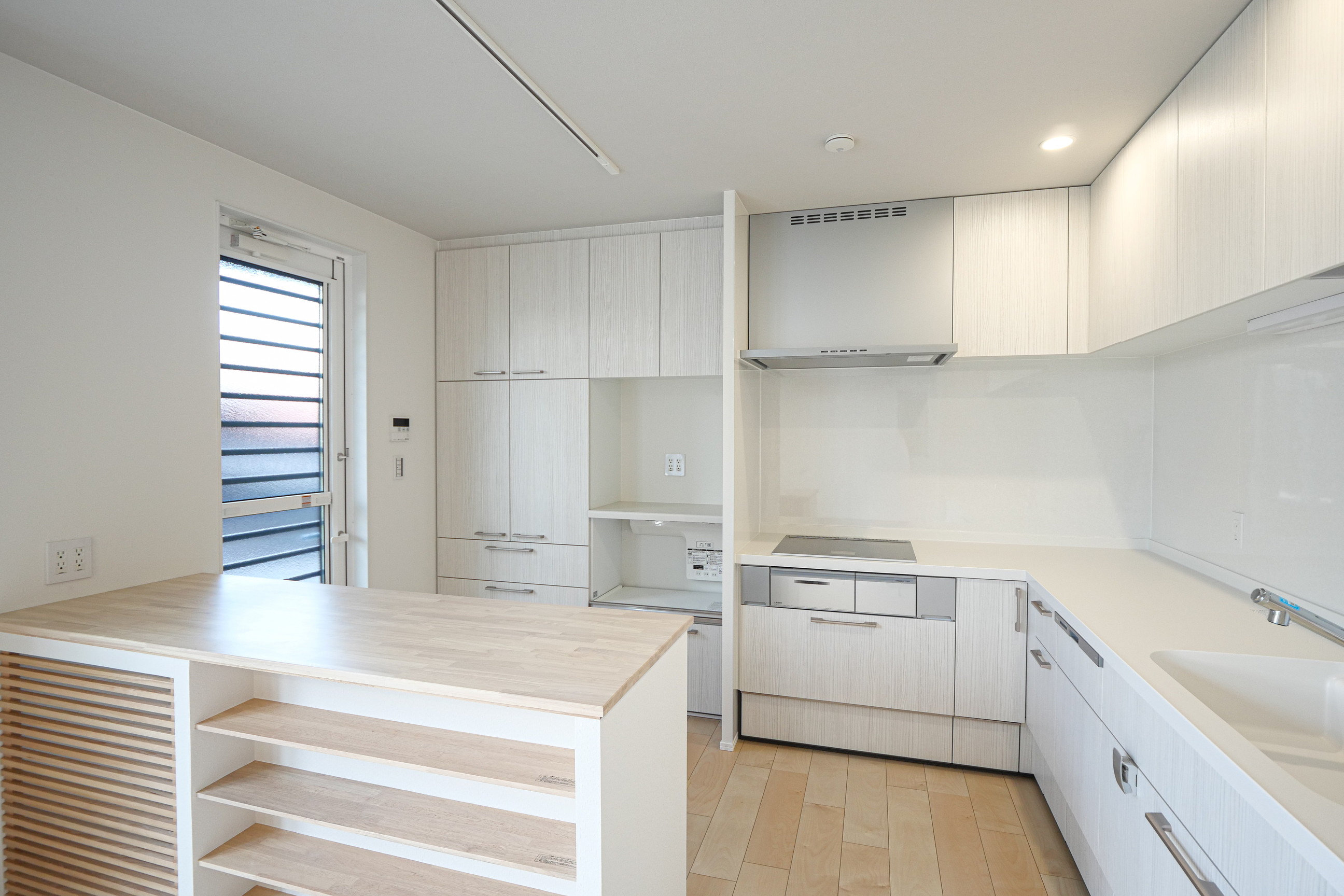 造作のキッチン作業台は、調理スペースとして使いやすく、リビング側は収納として活用できるため、見た目と使いやすさを両立しています。