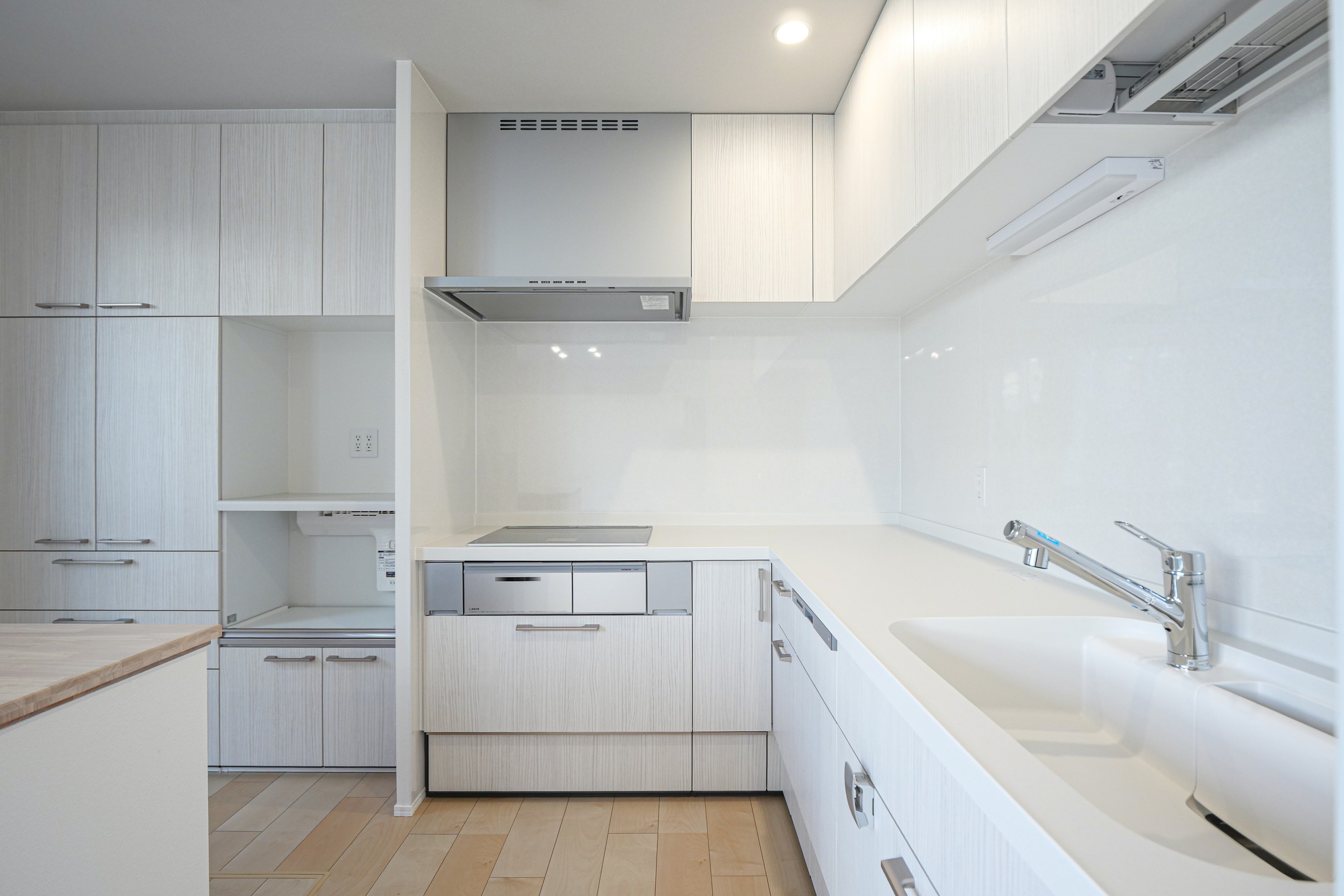 キッチンはL型を採用し、シンク・天板は人造大理石。天井近くまで高さのあるカップボードで収納力も確保しました。
