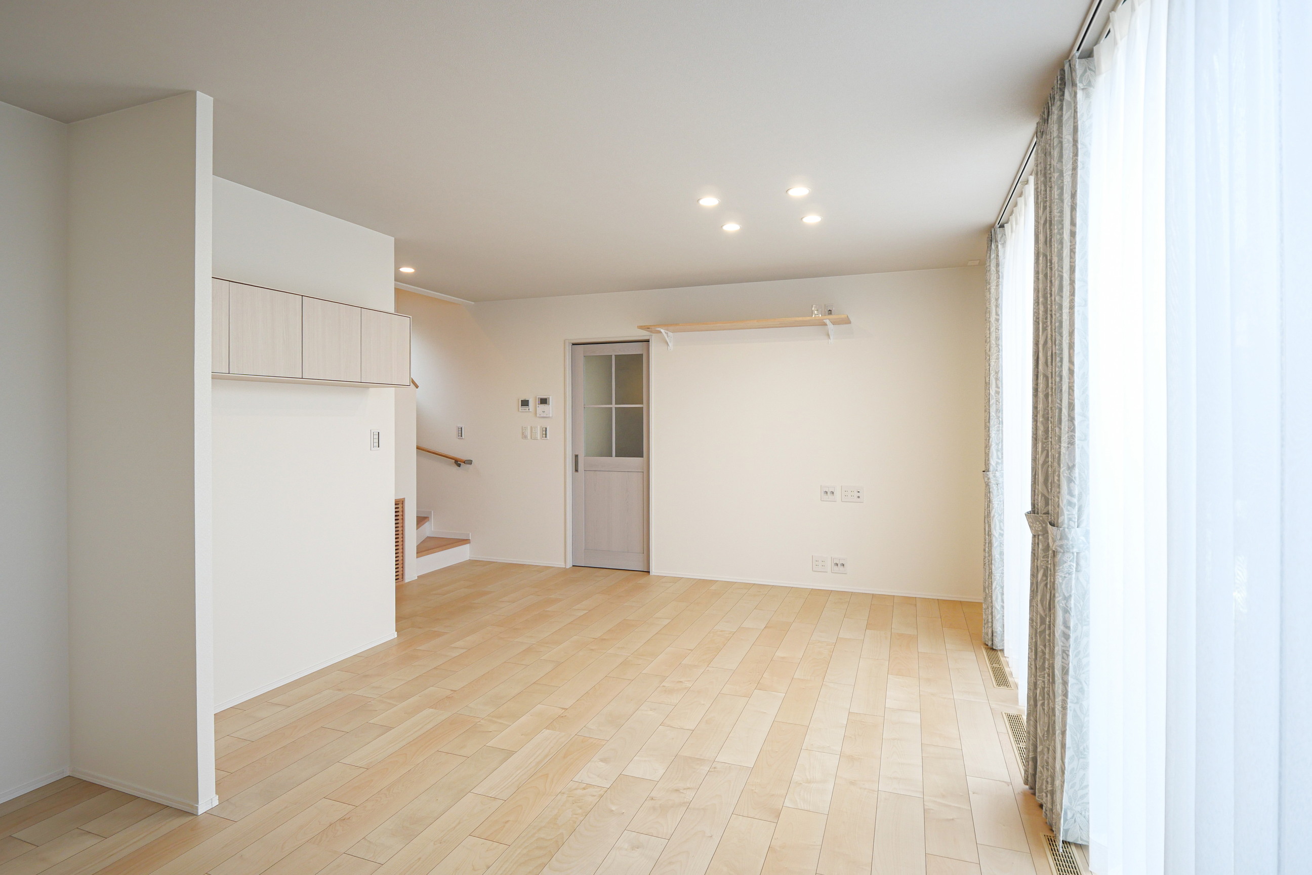LDKは約17.5帖ながら、ハイサッシを採用することで明るく、広がりを感じられる空間に。壁掛けテレビ上には棚板を設け、スピーカーを置いて音楽を楽しめるよう計画しています。