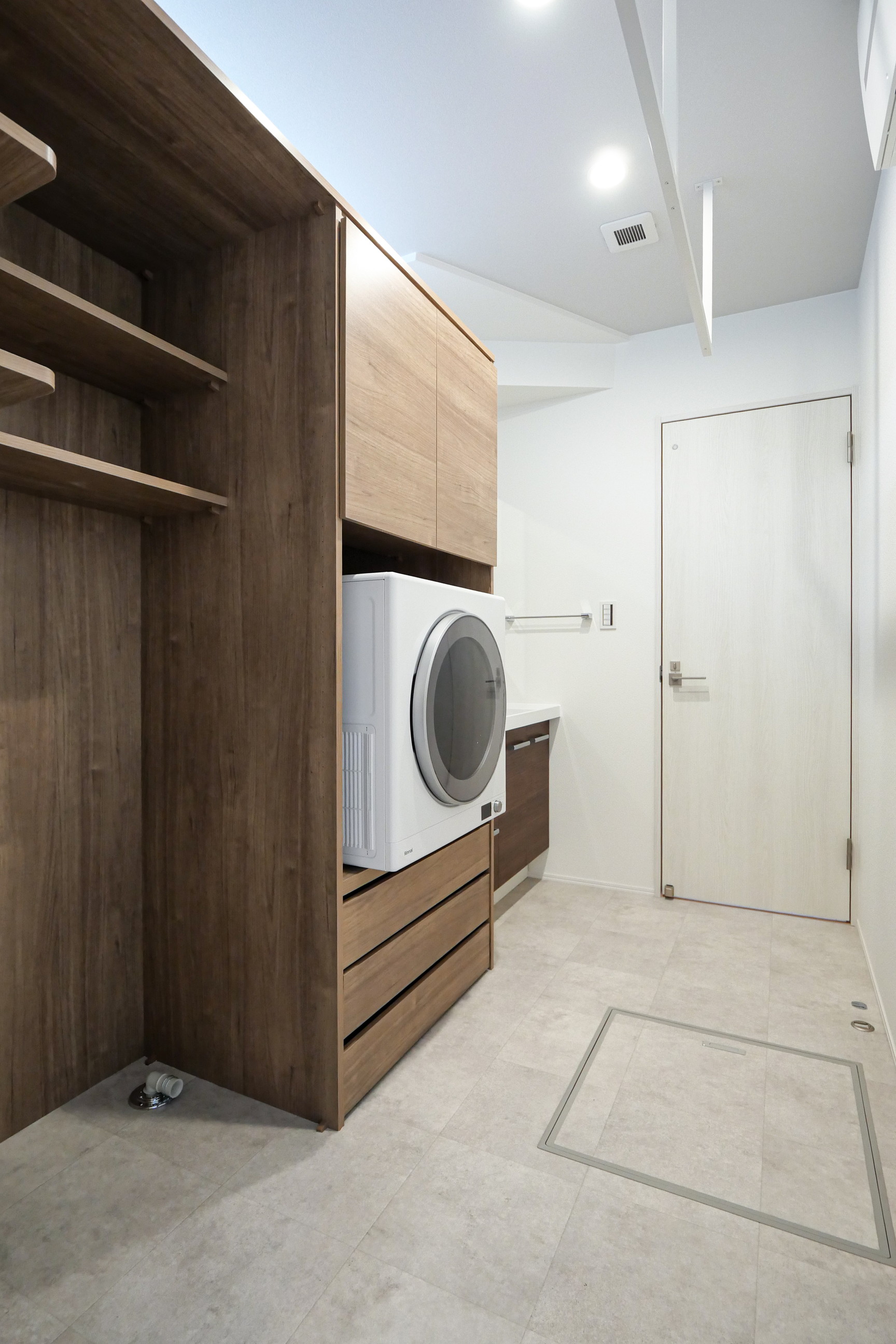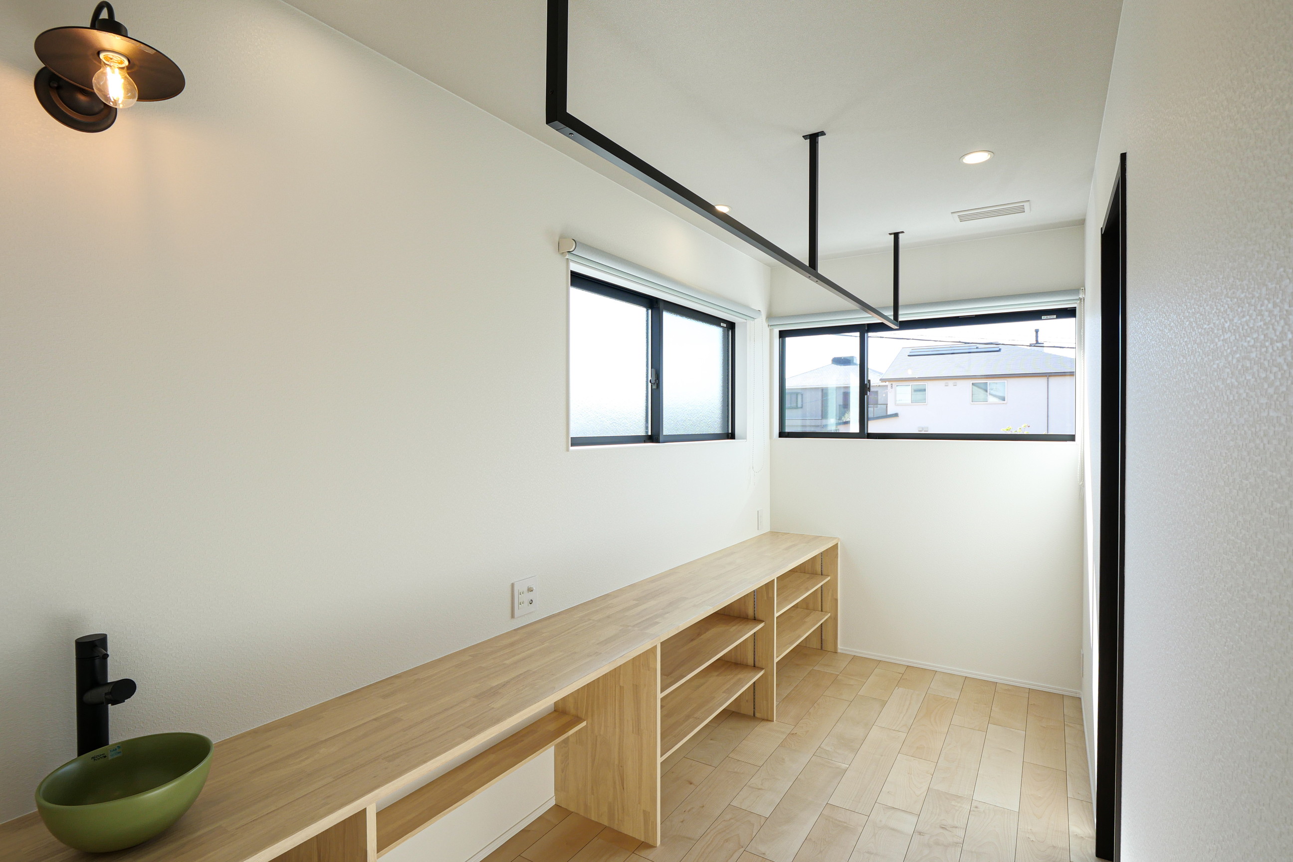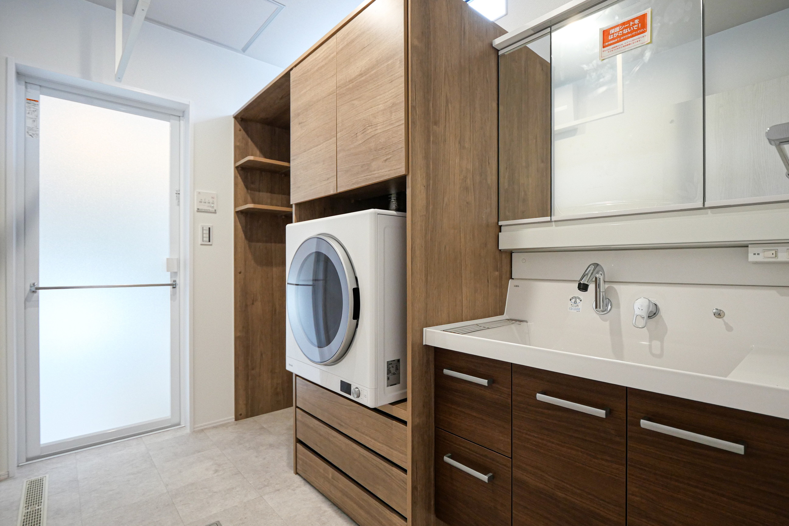 乾太くんを中心としたランドリー動線にこだわり、2階には約4帖のランドリースペースを設置。造作棚や手洗いスペースを備え、家事がしやすい間取りです。