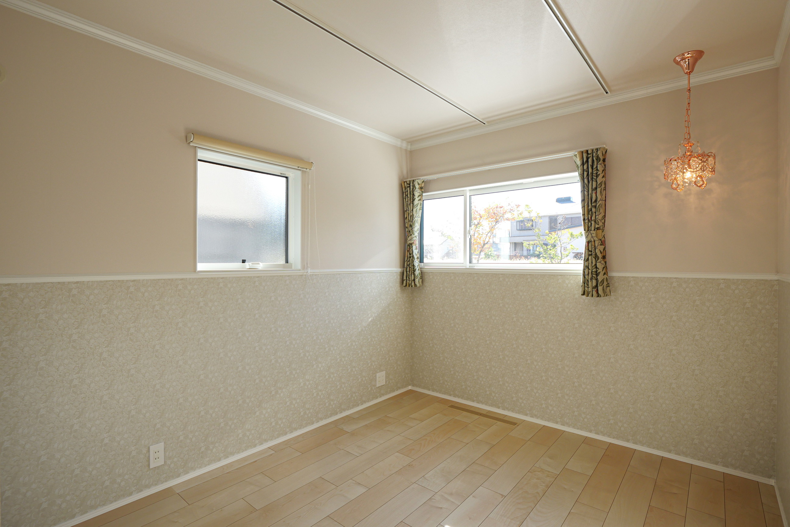 洋室は奥様のサロンルームとして使用。ウィリアム・モリス柄の壁紙やモールディング、カーテンまでこだわり、特別感のある空間に仕上げました。隣接するトイレにも一部同じクロスを使用し、統一感を持たせています。