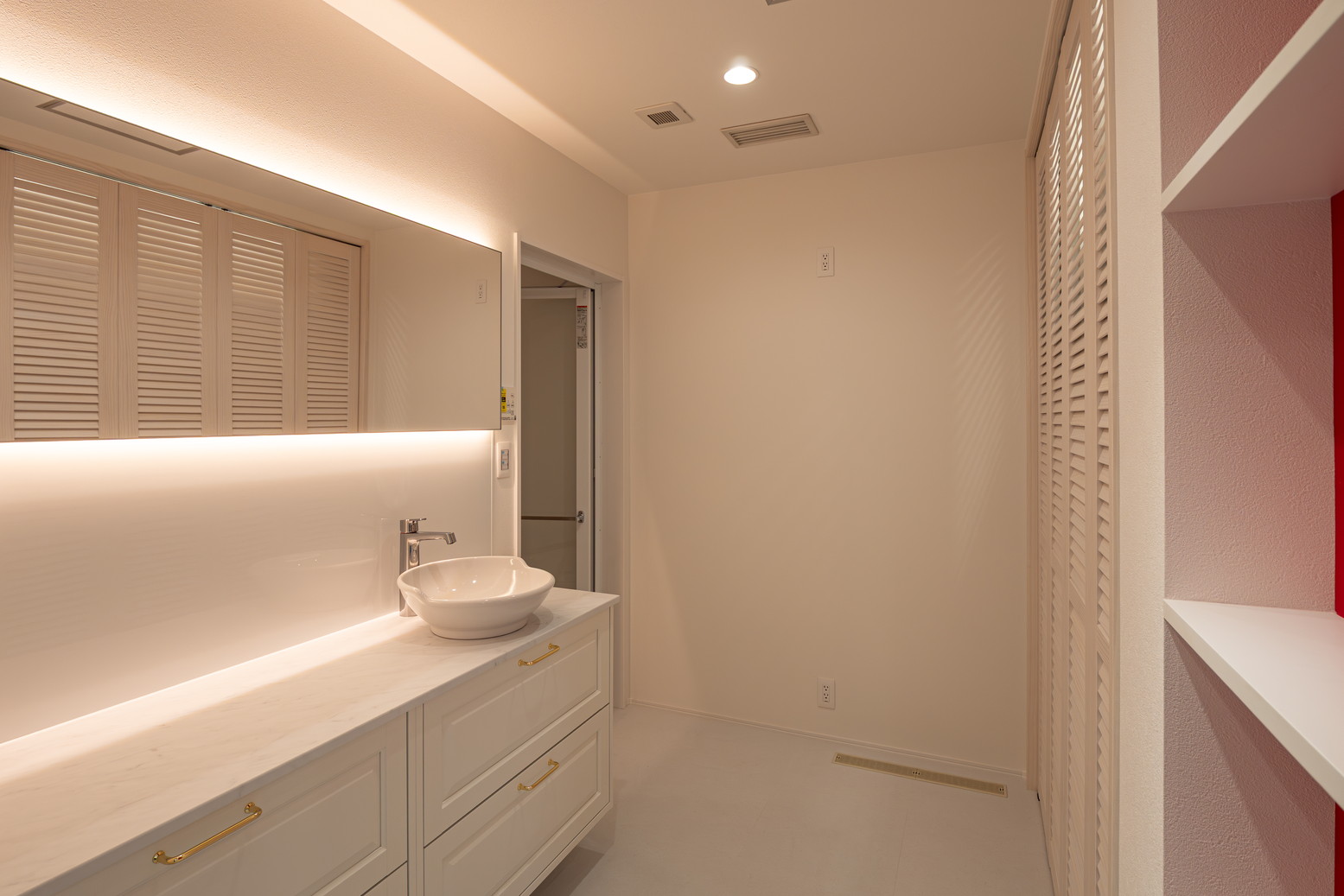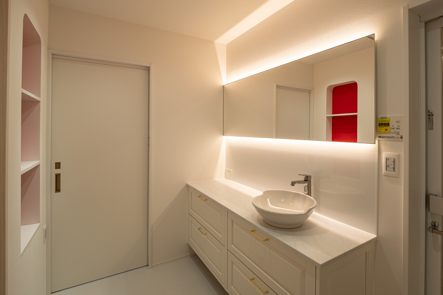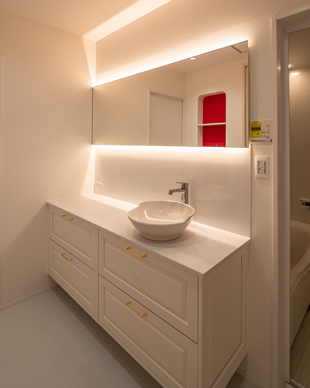 洗面スペースにはIKEAの設備を取り入れ、さらに造作のアーチ型ニッチを設けました。