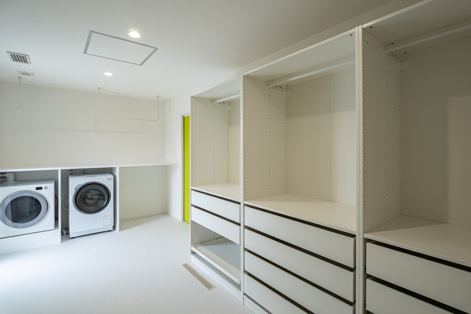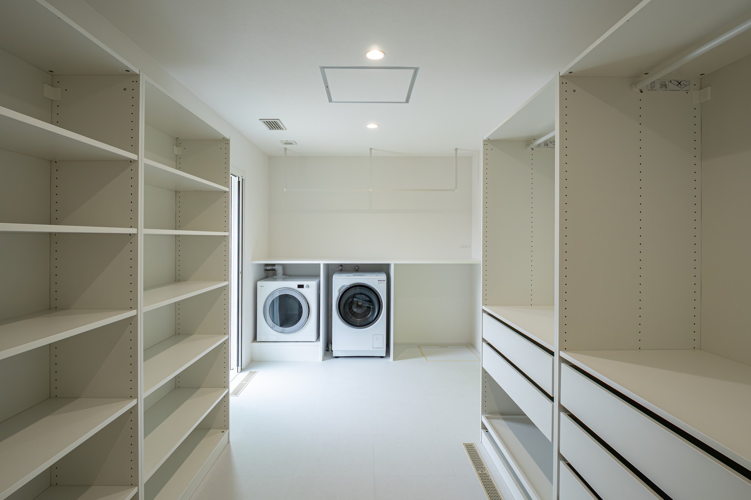 乾太くんで乾かした洗濯物をその場で畳み、すぐに収納できるよう計画。洗濯の一連の流れがスムーズにつながる動線にすることで、空間全体が自然と整います。