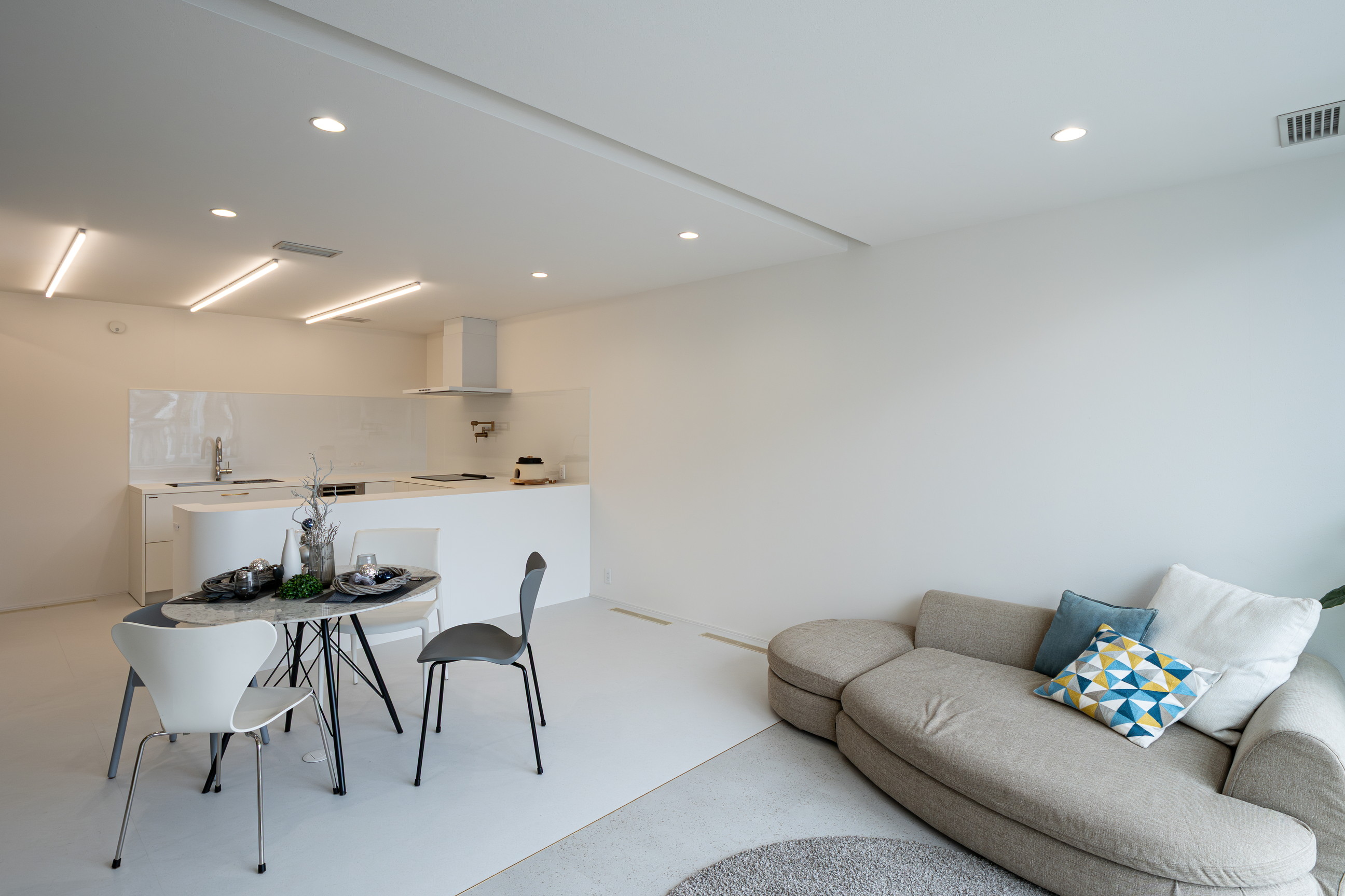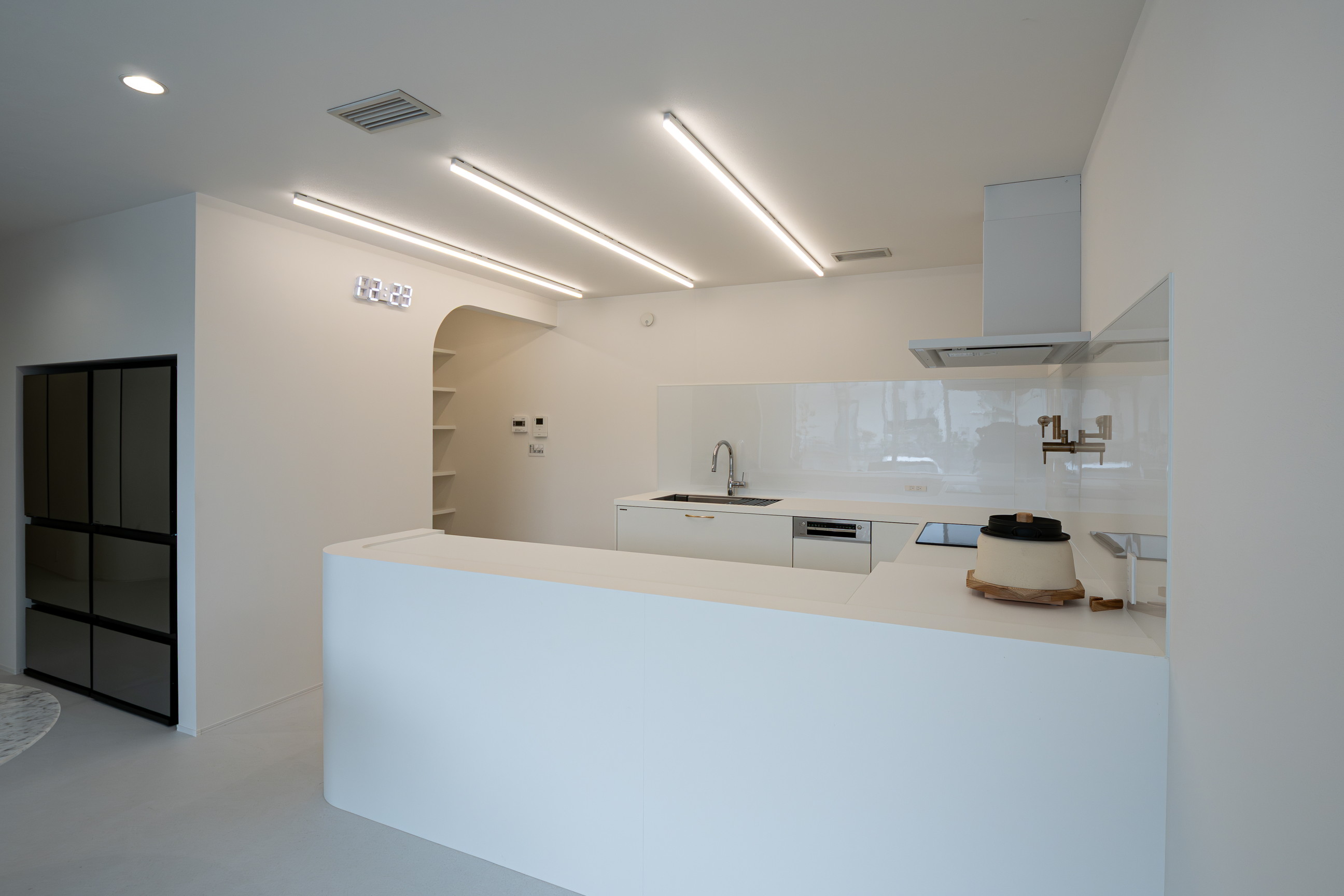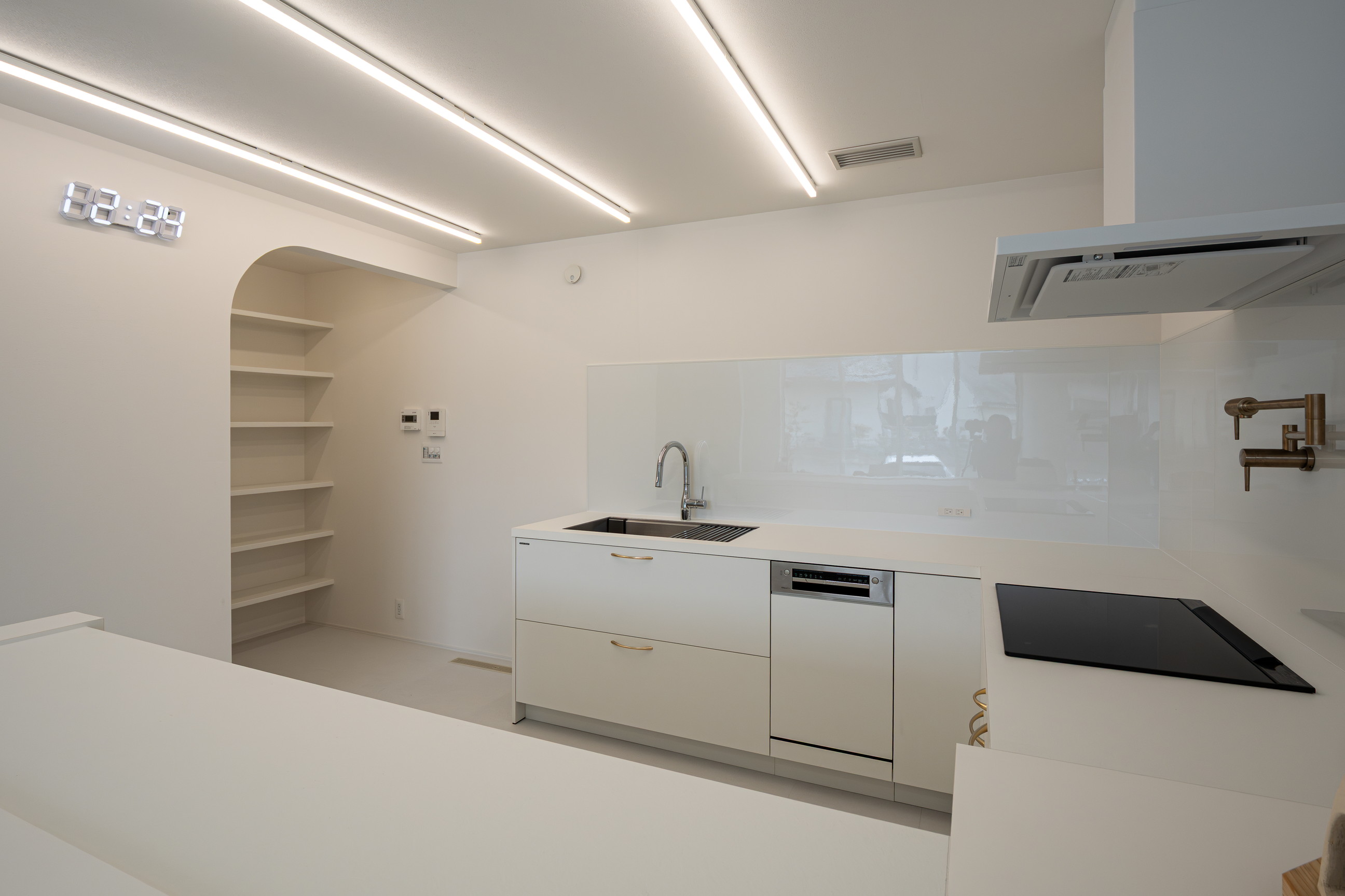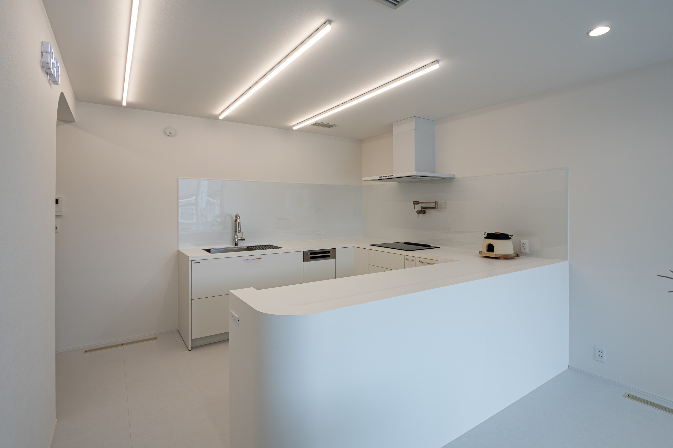 キッチンにはグラフテクトを採用し、白で統一されたLDKに調和するデザインに。ライン照明がアクセントとなり、空間を引き締めています。
