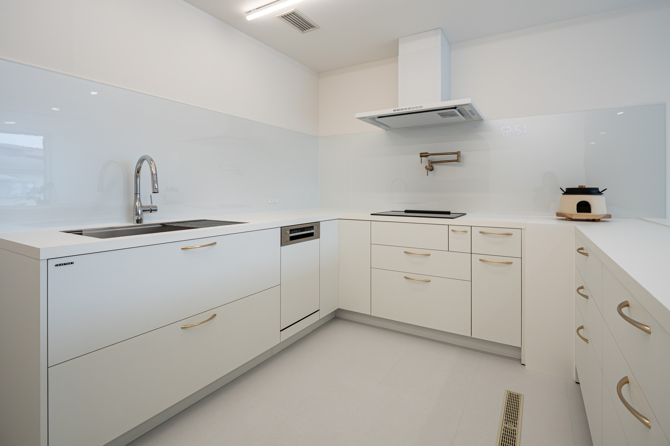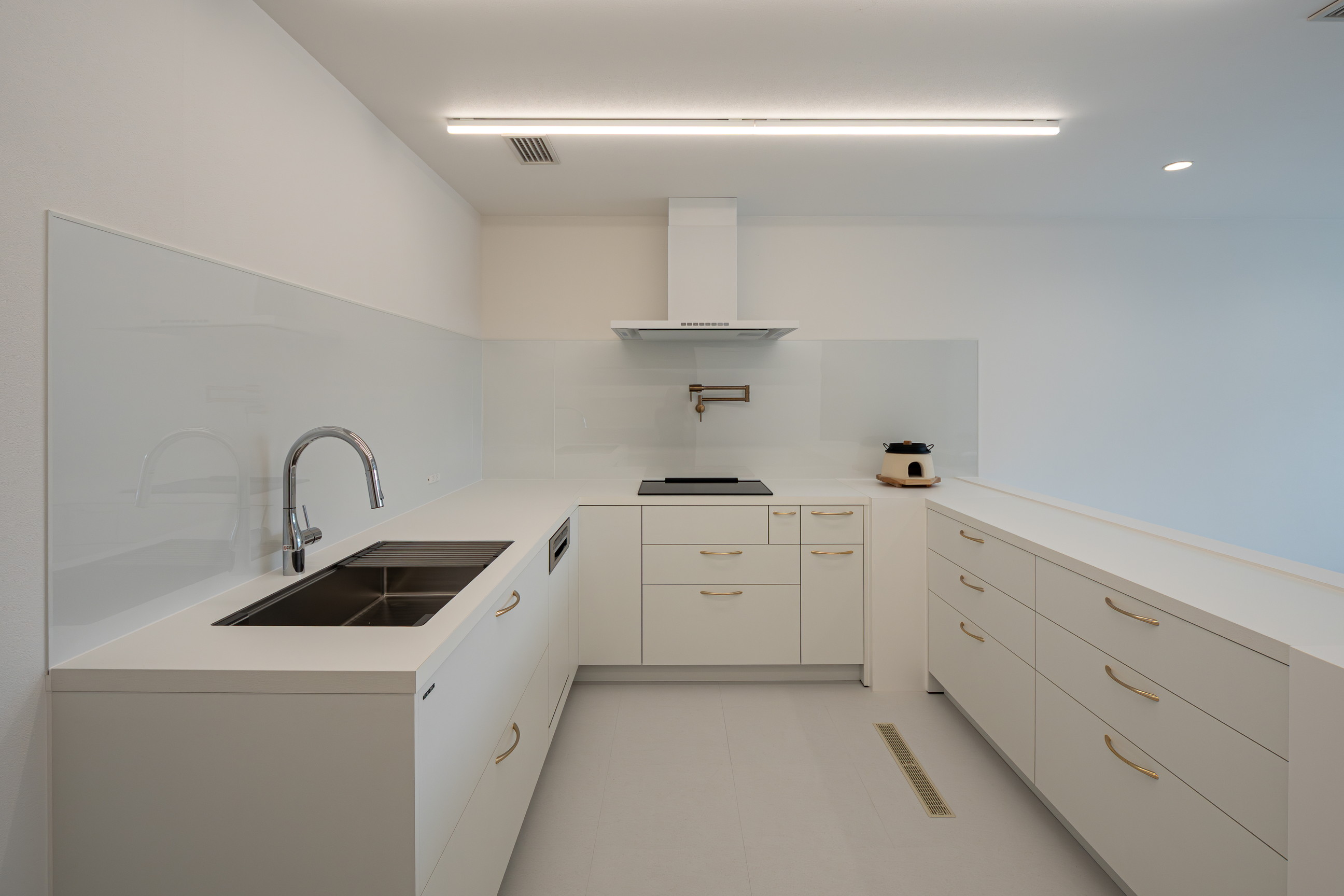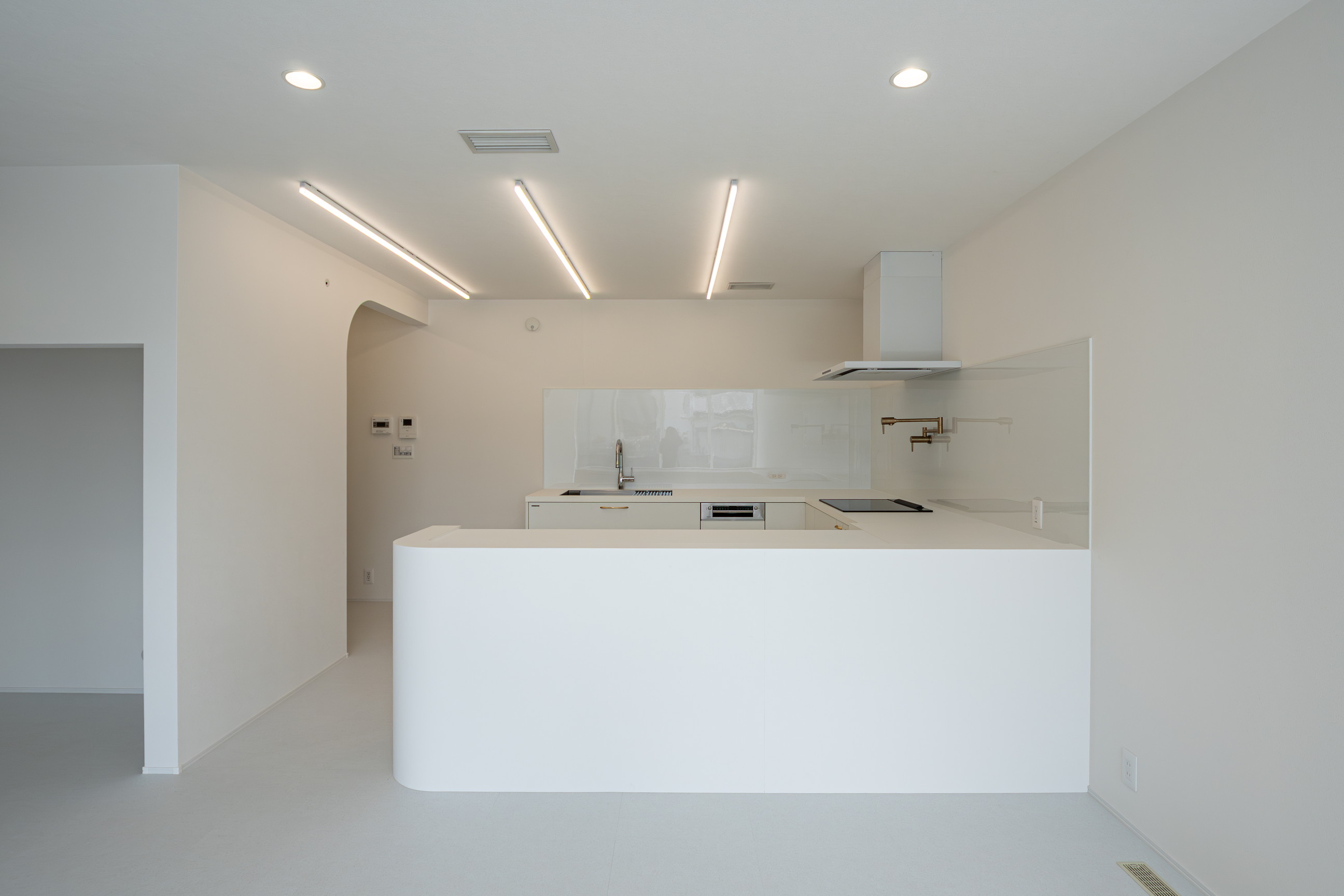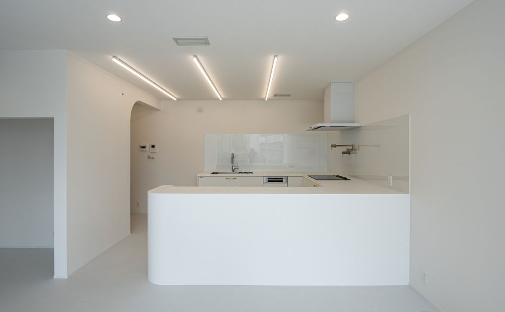 キッチンにはグラフテクトを採用し、白で統一されたLDKに調和するデザインに。ライン照明がアクセントとなり、空間を引き締めています。