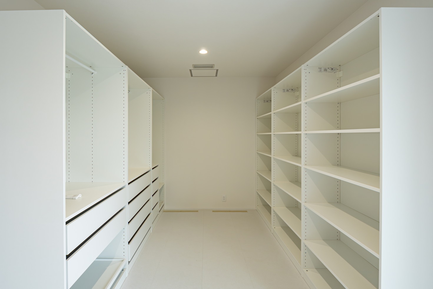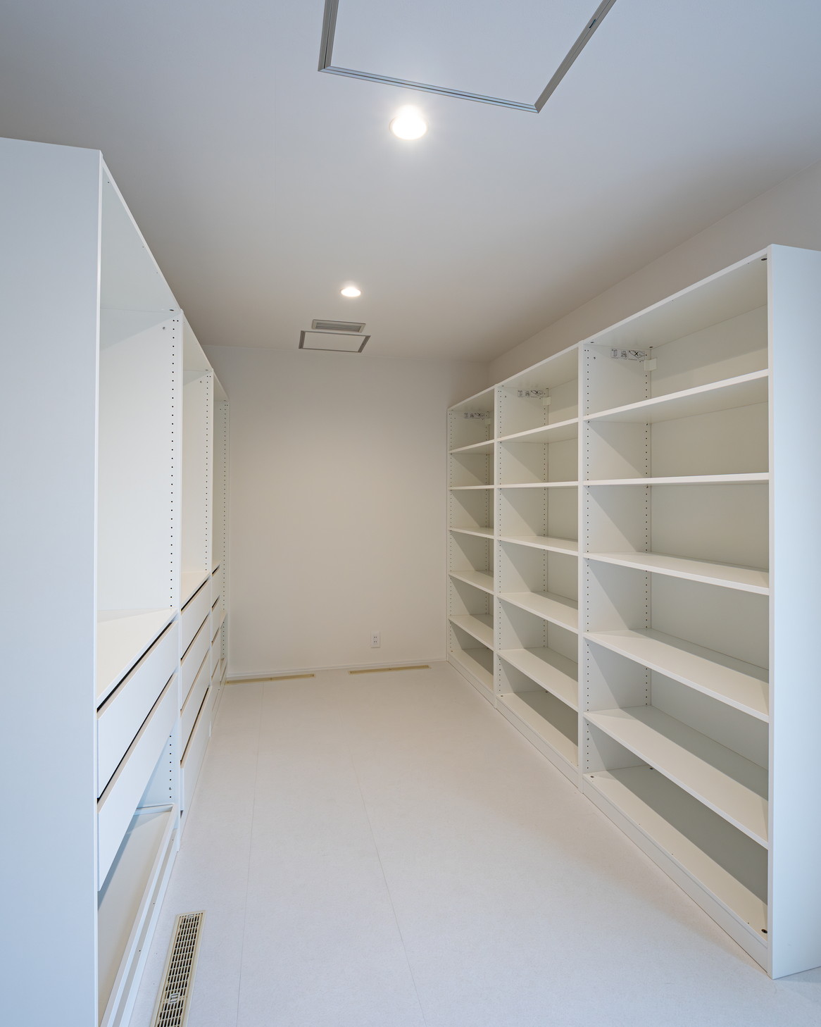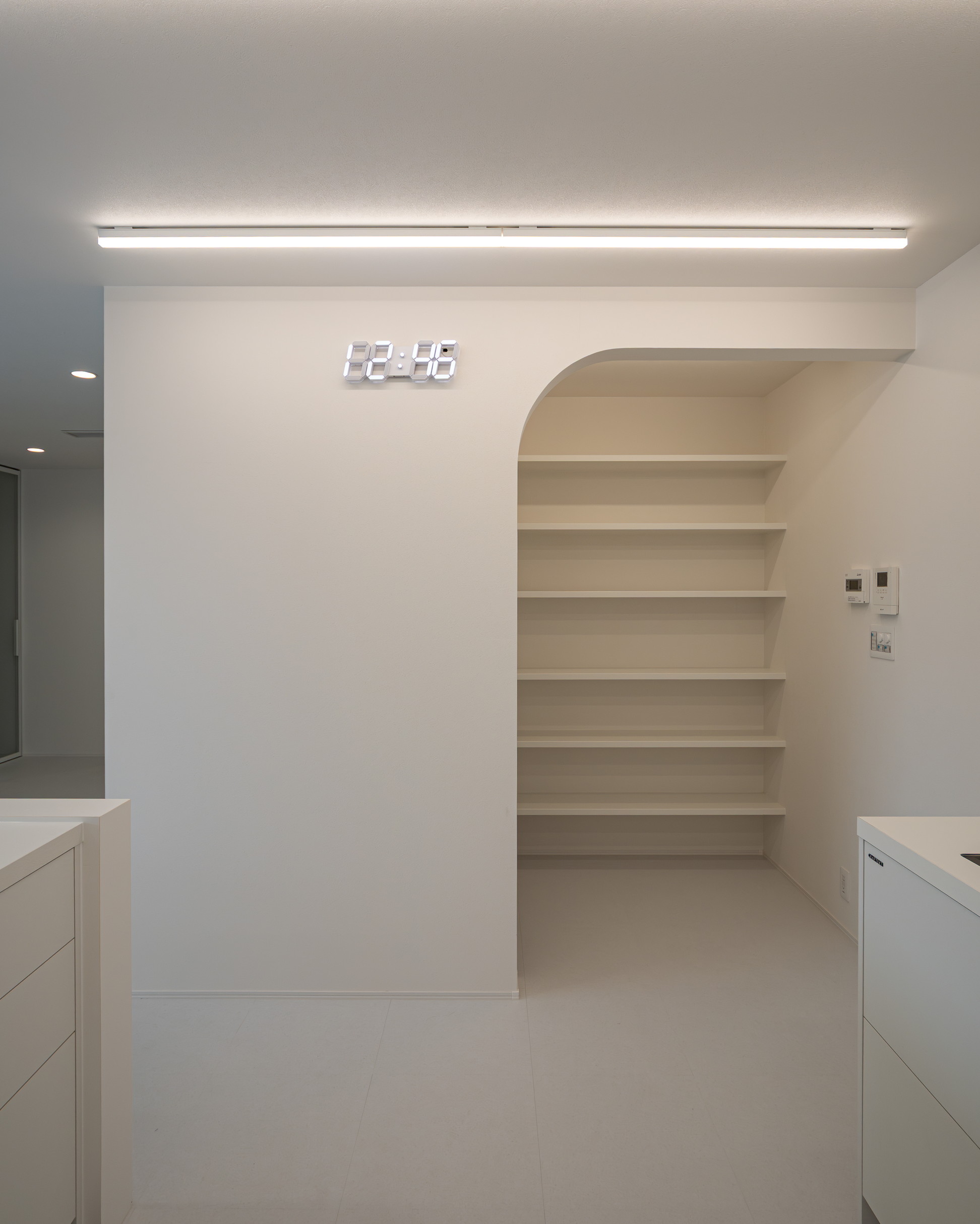 パントリーは、家電や収納物に合わせて棚の高さを事前に計画。さらに、パントリー外に設置する冷蔵庫の高さに合わせて垂れ壁も調整し、使いやすさと収納力を両立した空間に仕上げました。