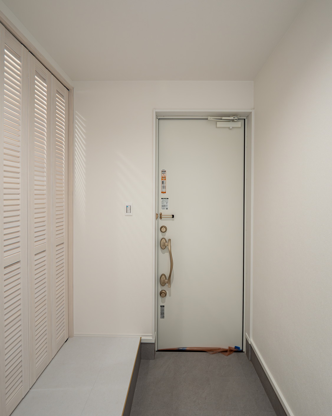 玄関と洗面には、ウッドワン製のルーバー建具を採用。木の質感と格子状のデザインが、空間にやわらかさと抜け感を生み出しています。
