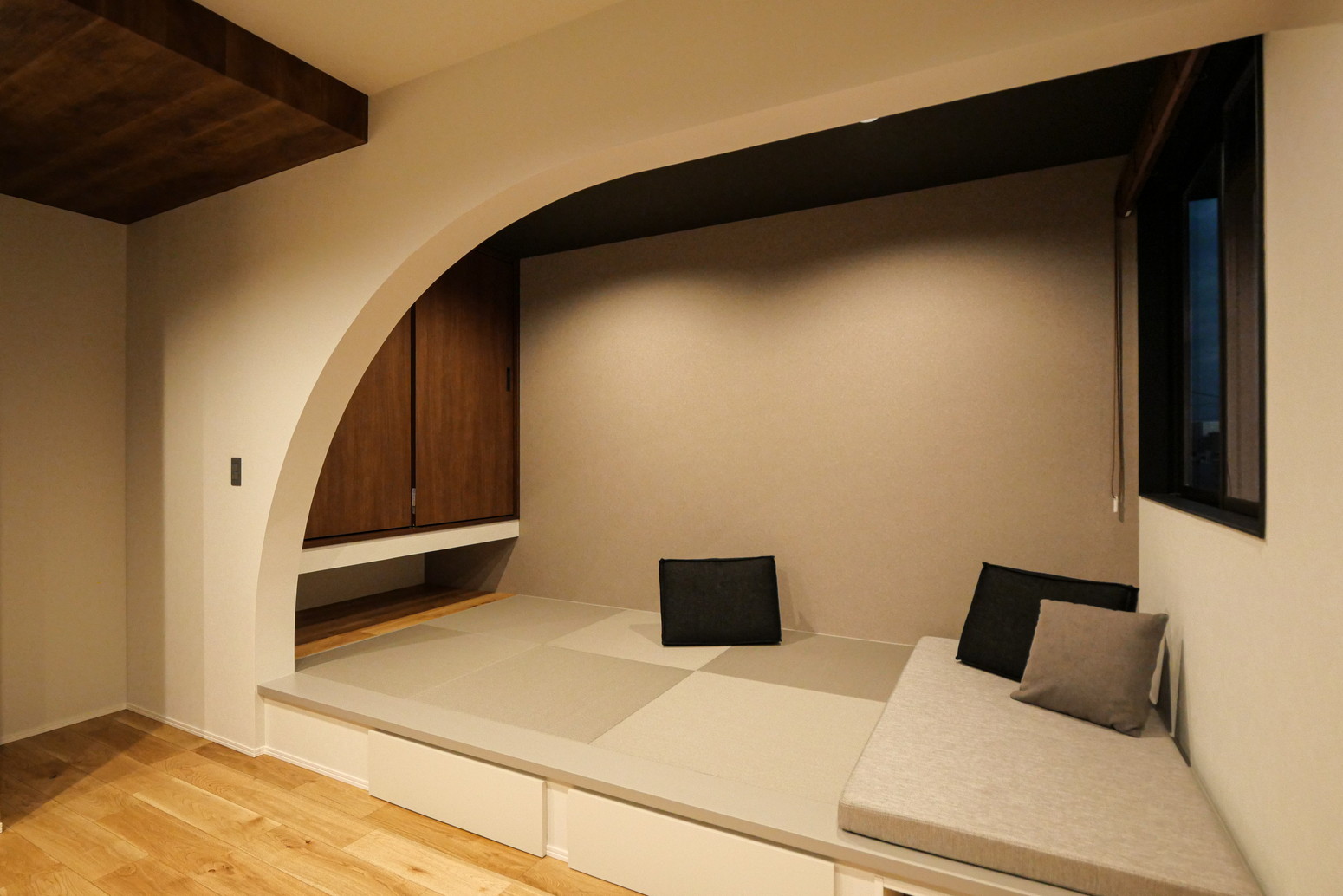 アーチ垂れ壁が印象的な和室は、デザイン性と落ち着きを兼ね備えた空間。