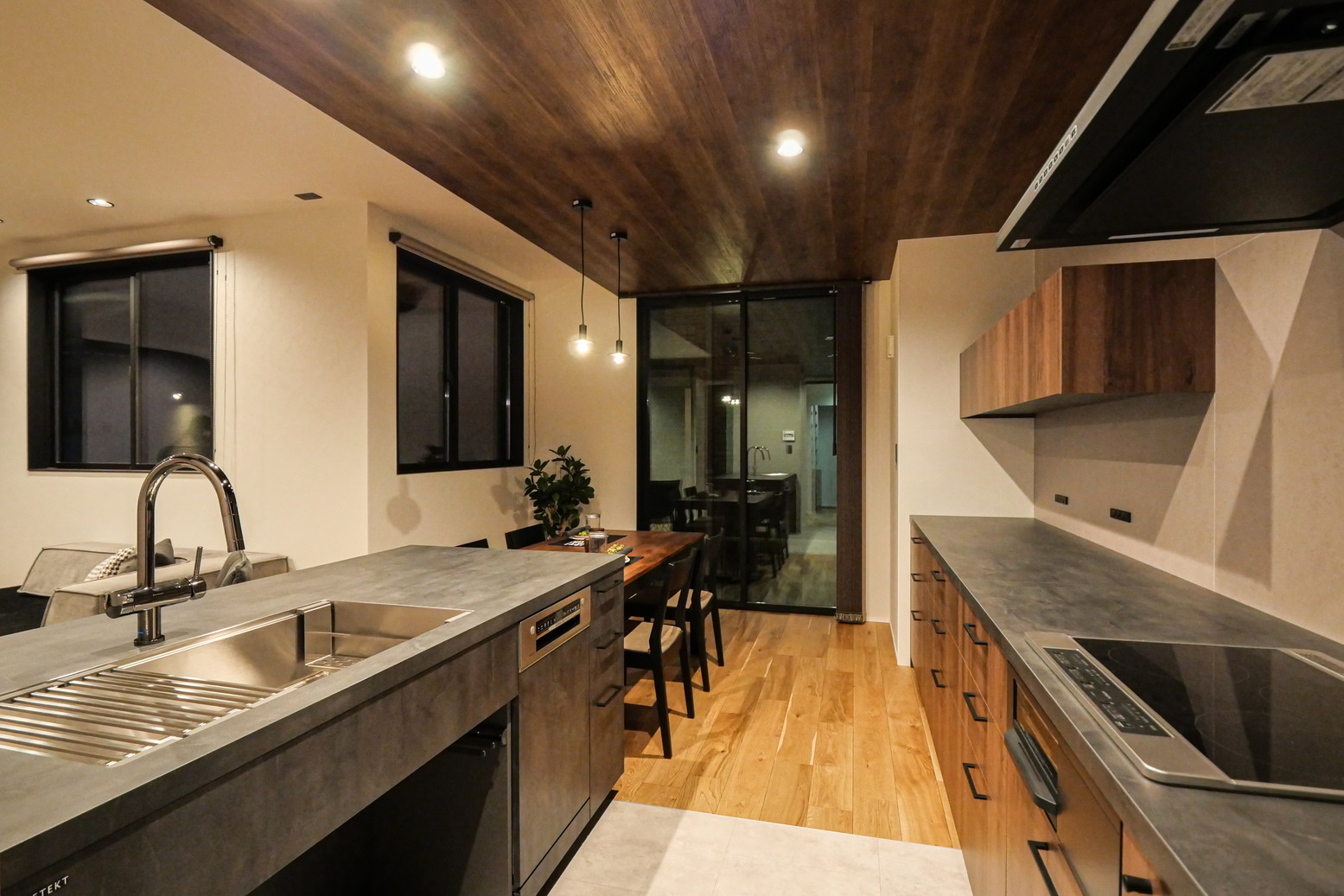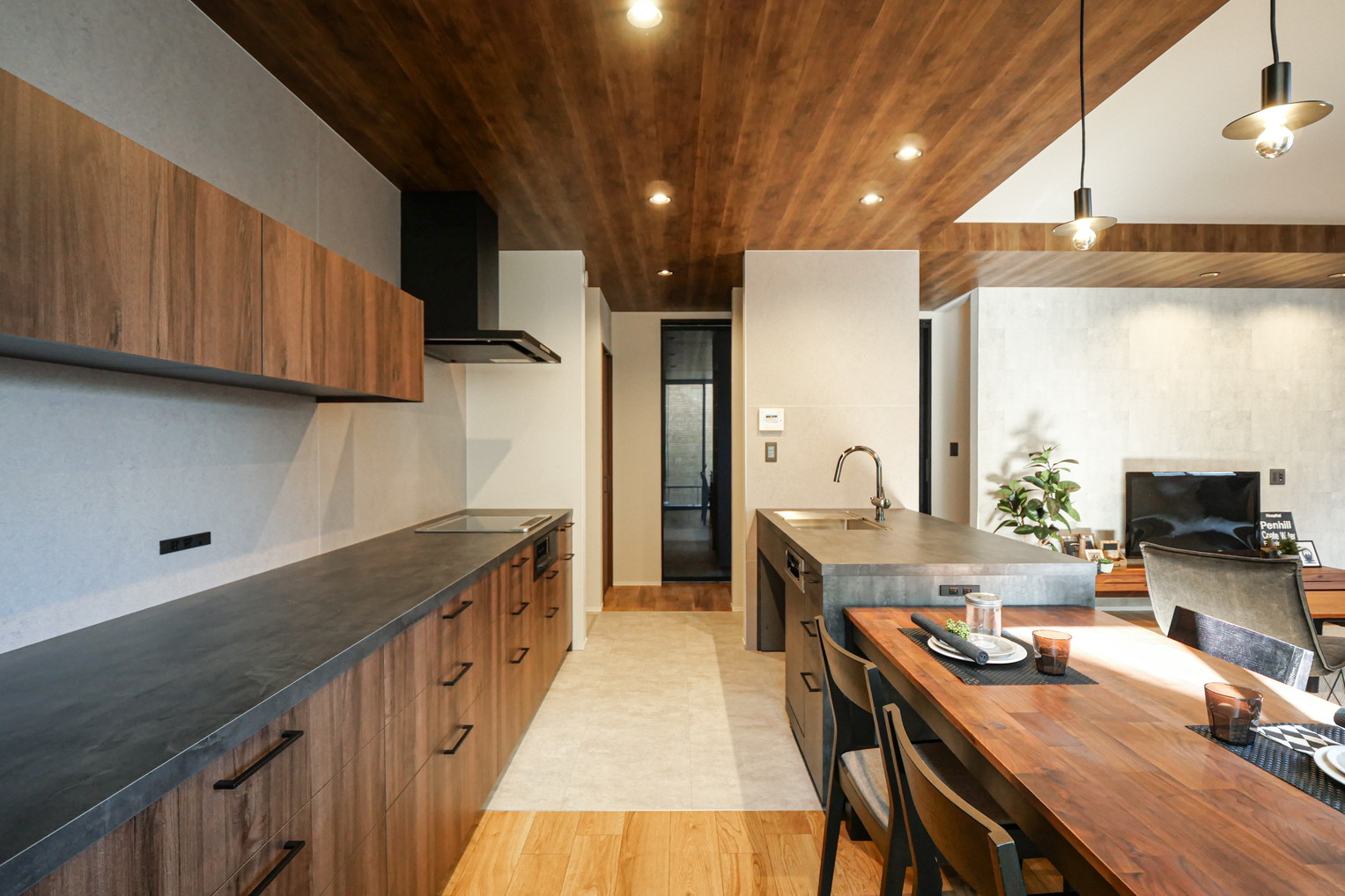 グラフテクトキッチンは配色にもこだわり、ダイニング収納を備えた機能的なプランに。