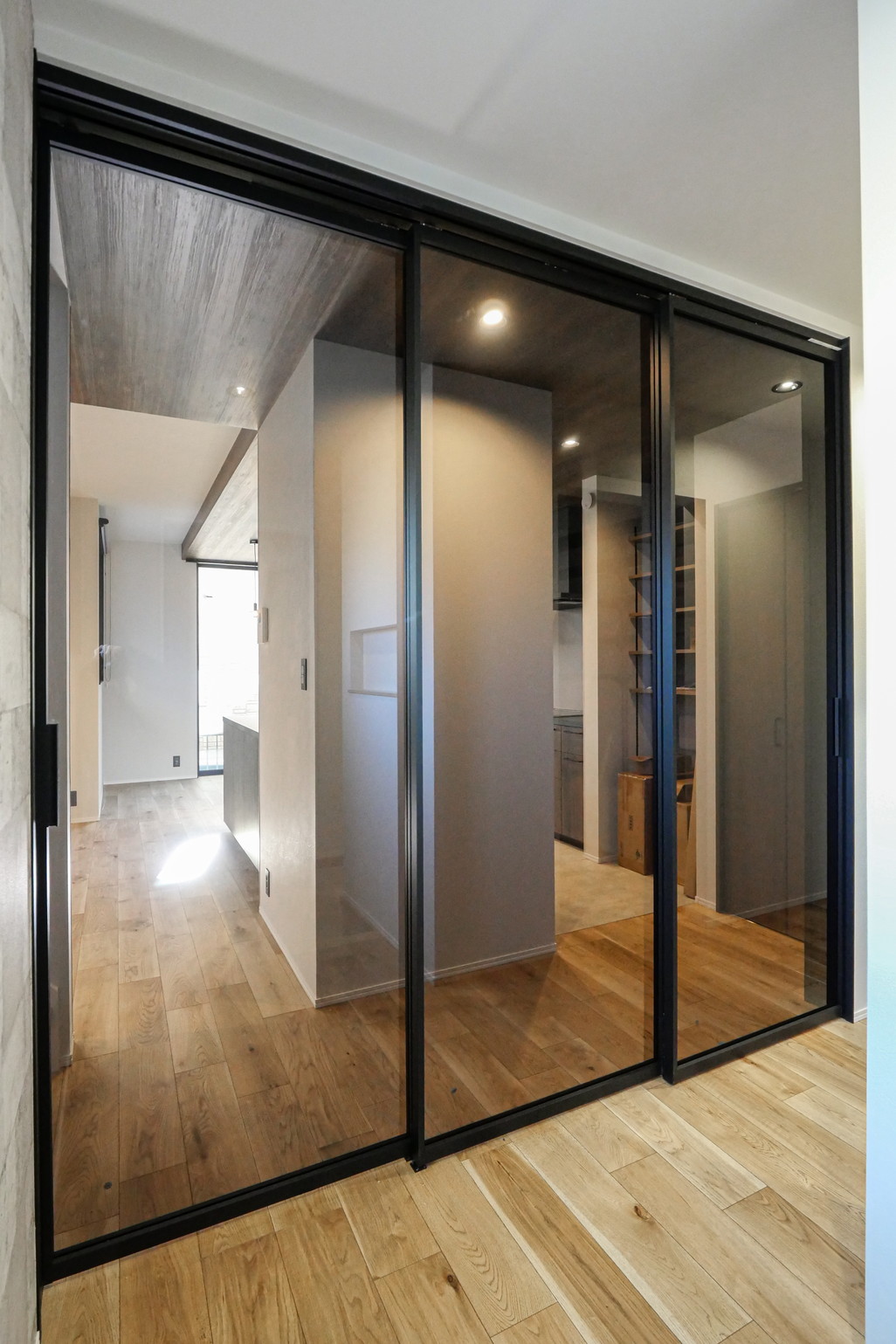 ガラス色はグレーを選び、空間を引き締めながらも、圧迫感のないすっきりとした印象に仕上げました。