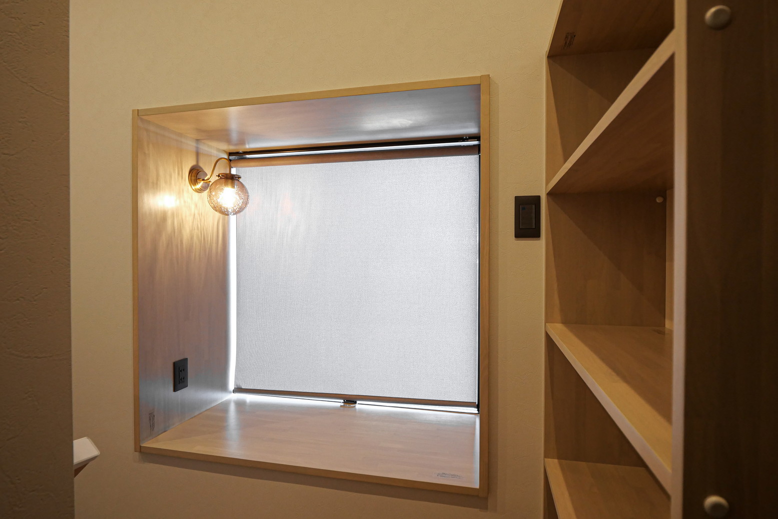 階段踊り場には本棚を2段設けたヌックを配置し、腰掛けながら読書が楽しめるスペースにしています。