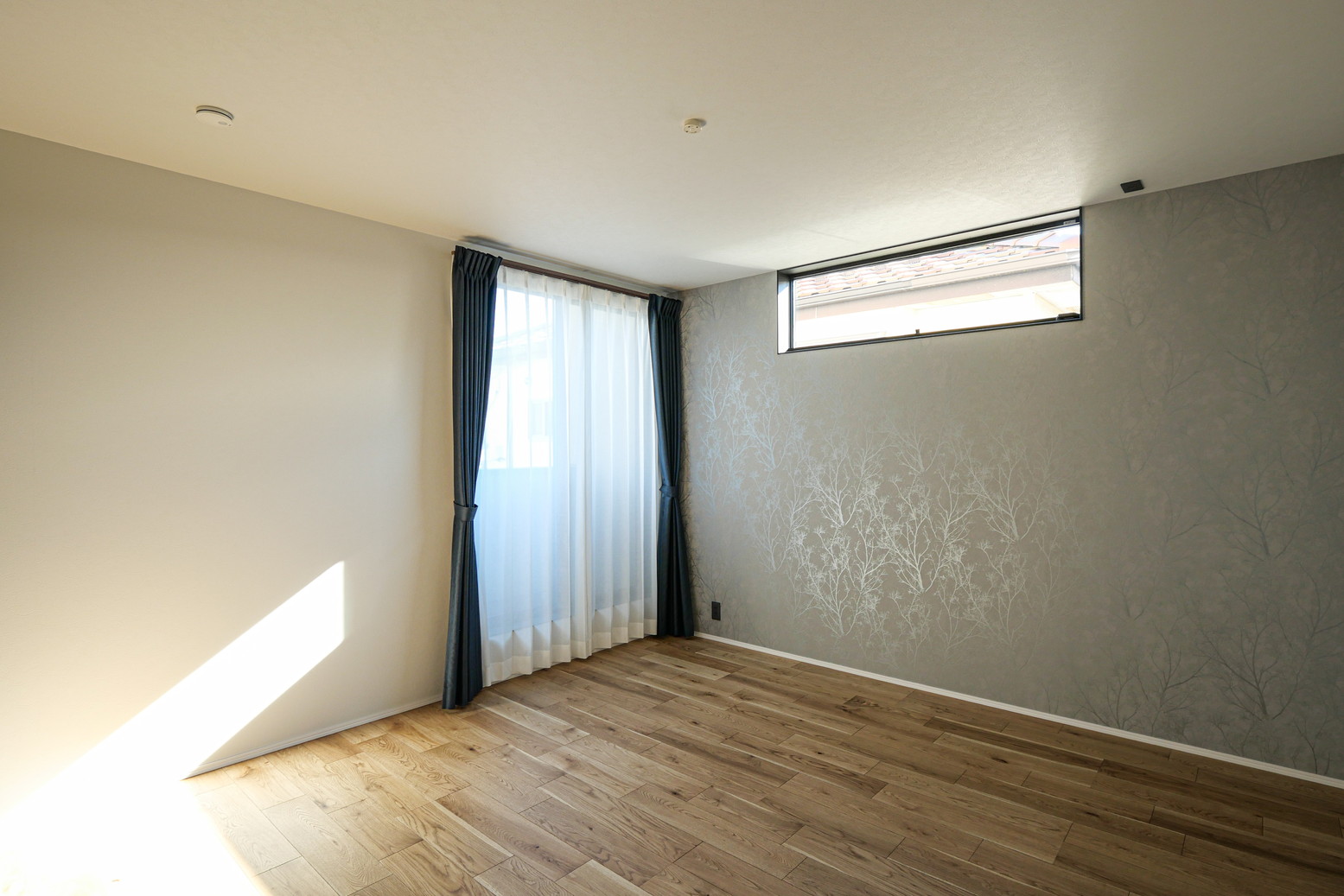 LDK・主寝室・和室それぞれにアクセントクロスを取り入れ、空間ごとに異なる表情を演出。