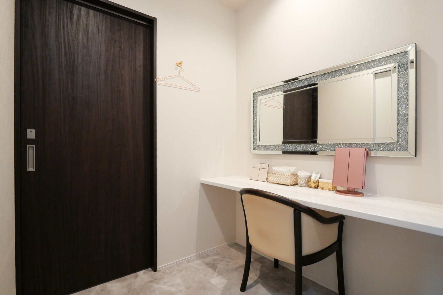 お客様が使用するメイクカウンターは、広々とした設計で快適にお使いいただけるよう、コンセントも設置しました。