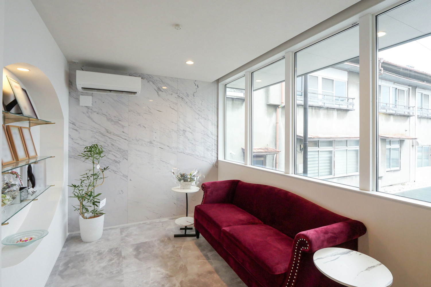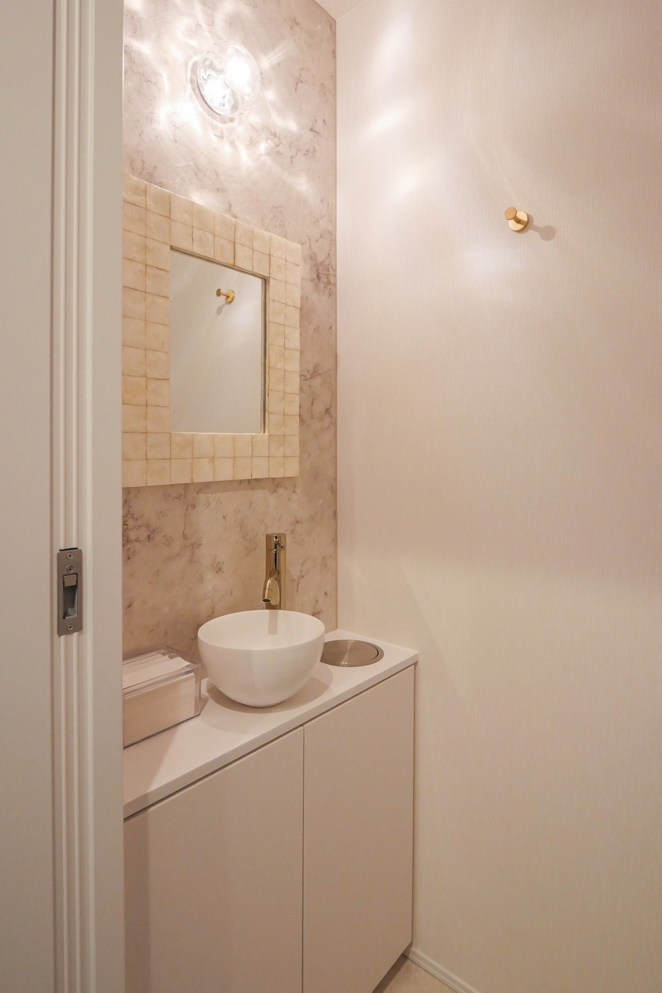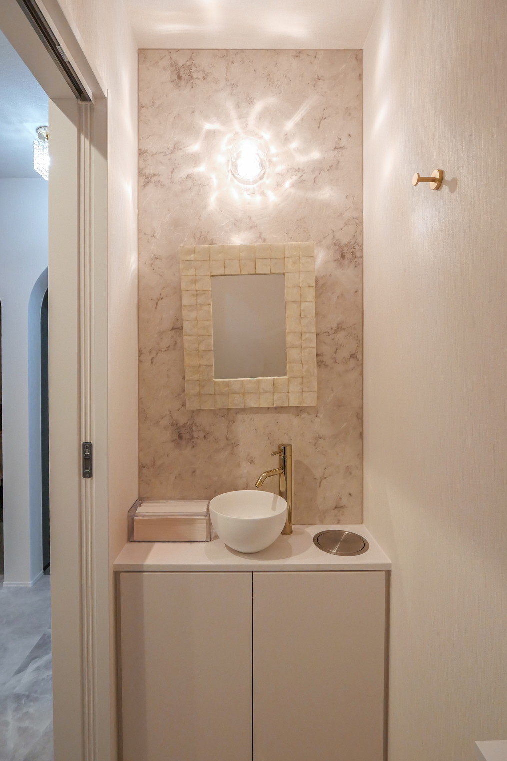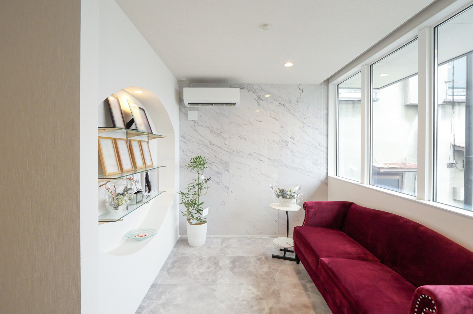 自然光がたっぷりと入る明るく開放的な空間に。壁一面には大理石柄のパネルを施工し、上質で洗練された印象をプラスしています。